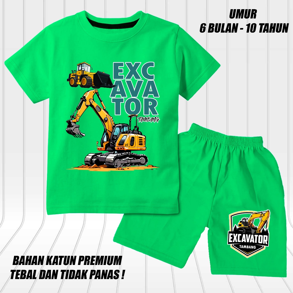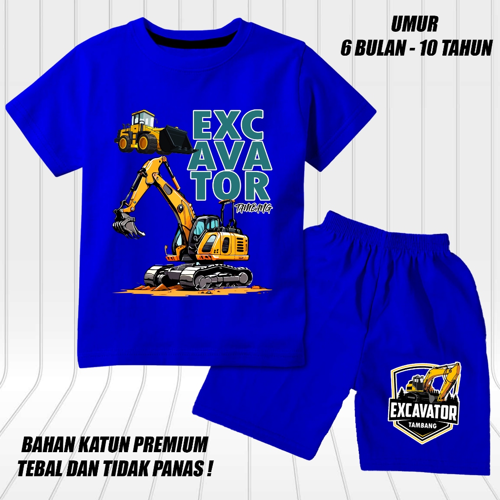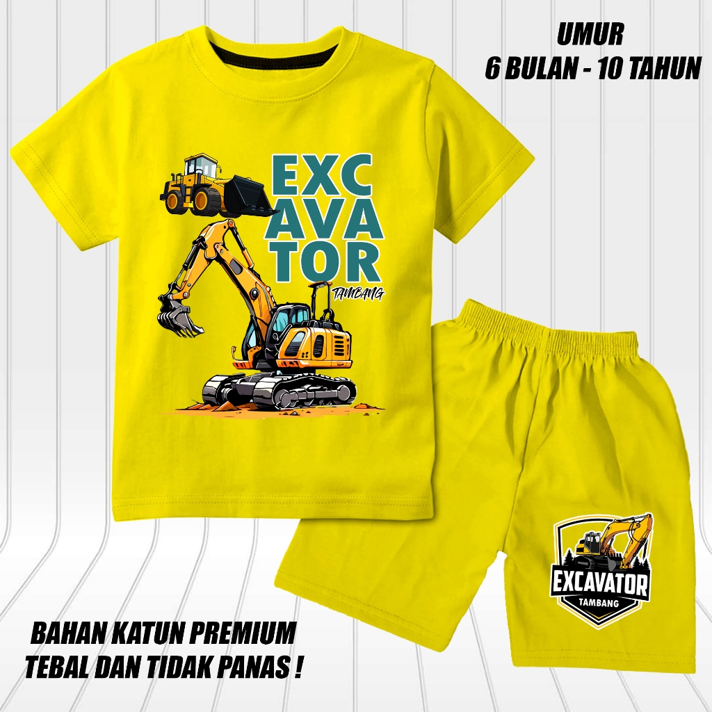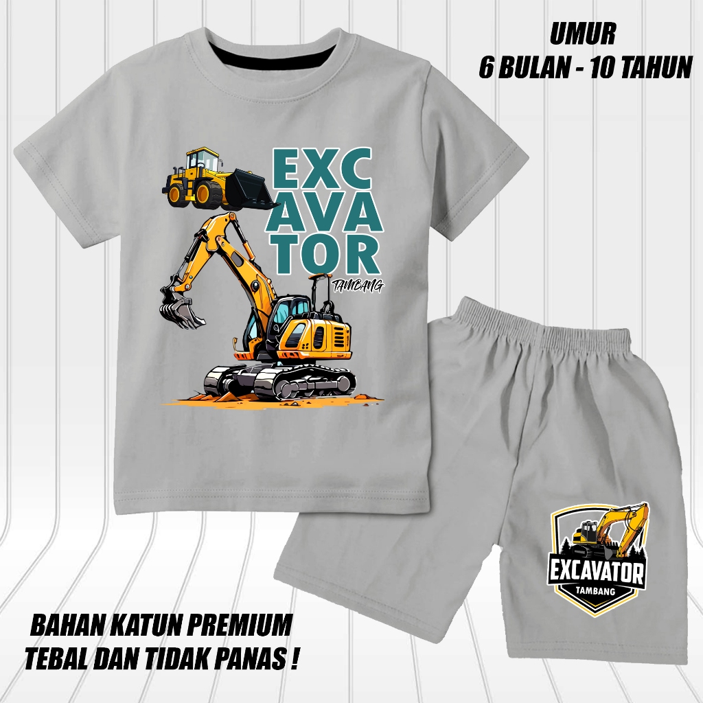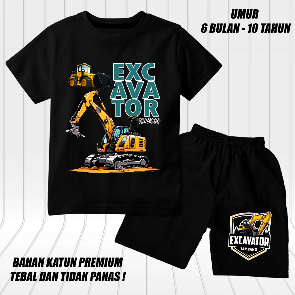 setelan lengan pendek anak laki laki perempuan set baju kaos pendek anak cowok motif excavator 2 tambang DTF