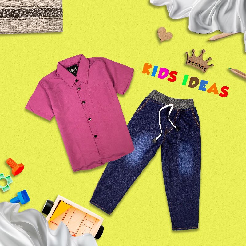 Setelan Anak Laki Baju Kemeja Lengan Pendek dan Celana Panjang Jeans konveksi Aji