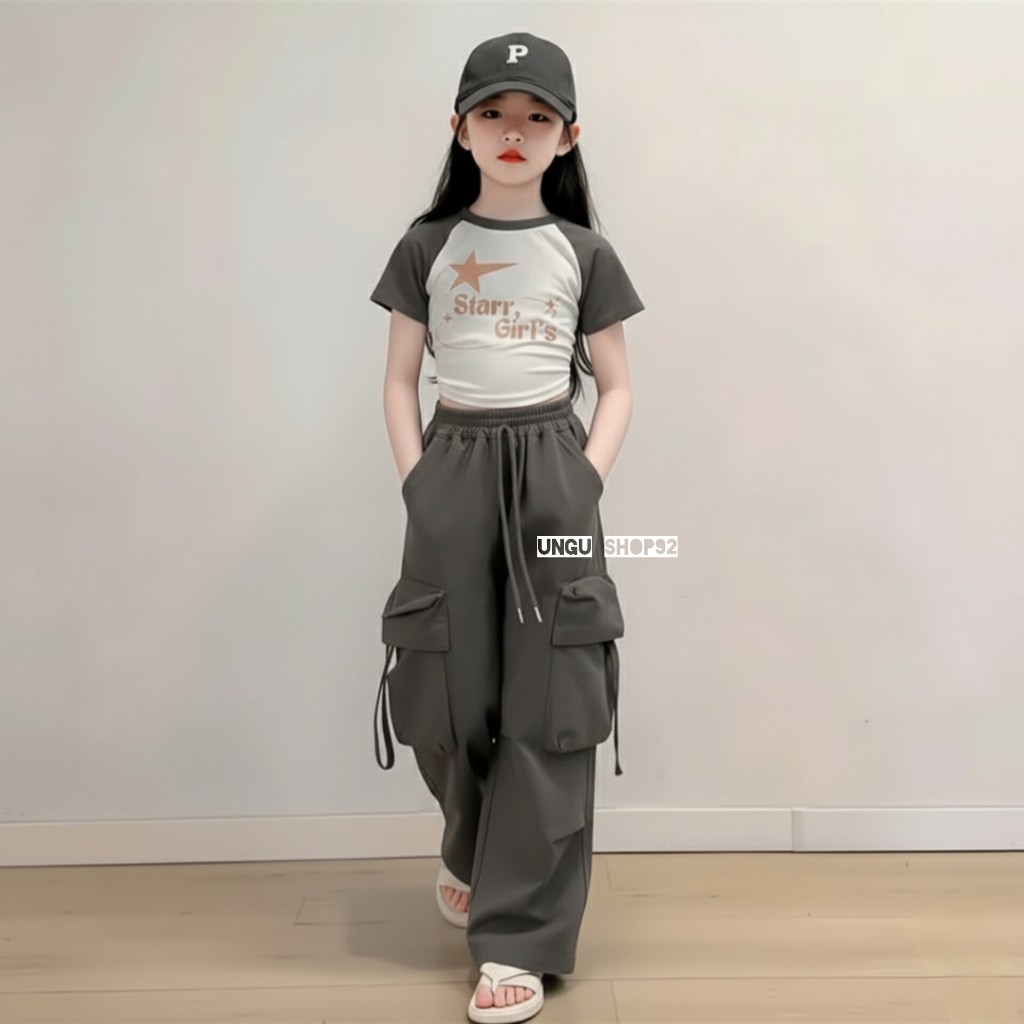 One Set Korean Starr Girls Baju Anak Perempuan Kaos dan Celana Cargo 1-12 tahun
