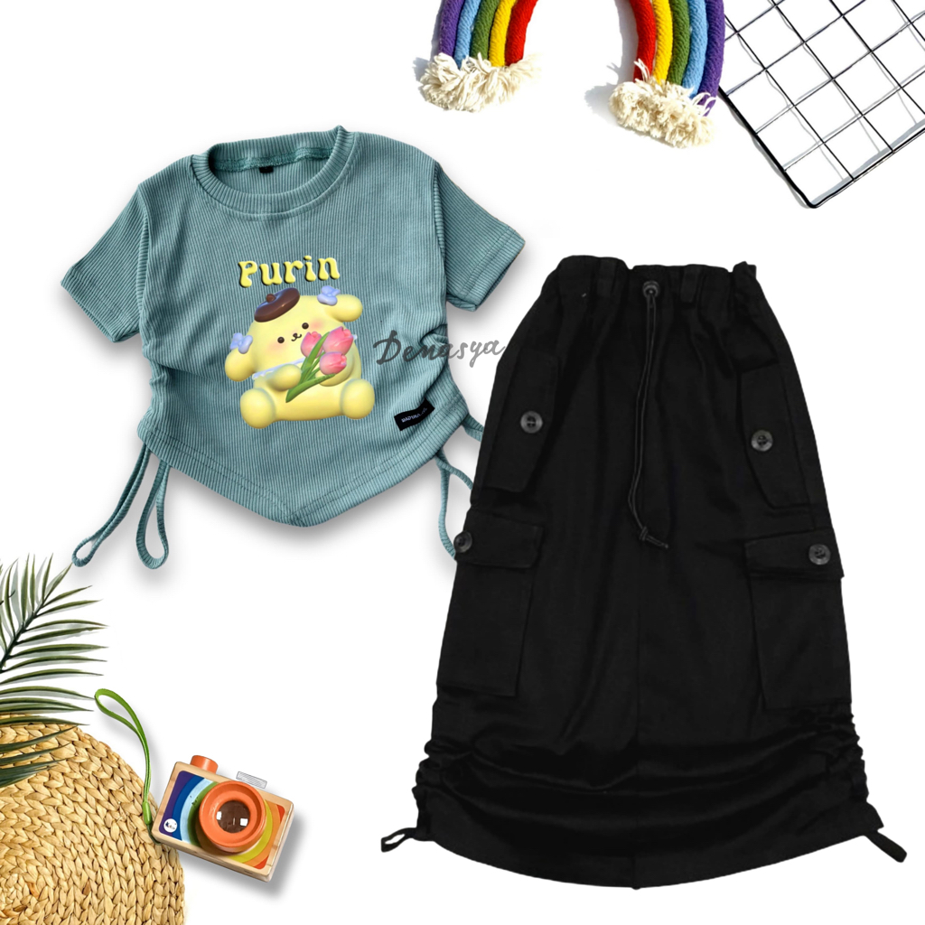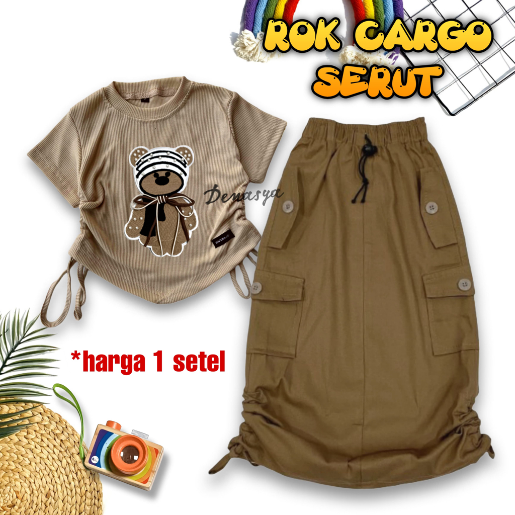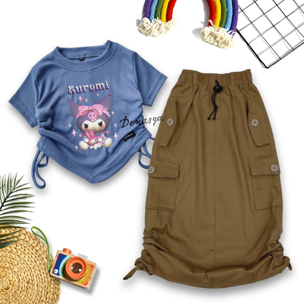 SETELAN KEKINIAN ANAK PEREMPUAN / ROK CARGO KATUN ANAK IMPORT / BAJU KNIT SERUT SABLON 1-12 TAHUN