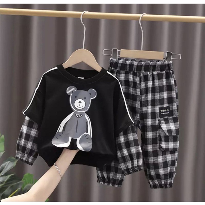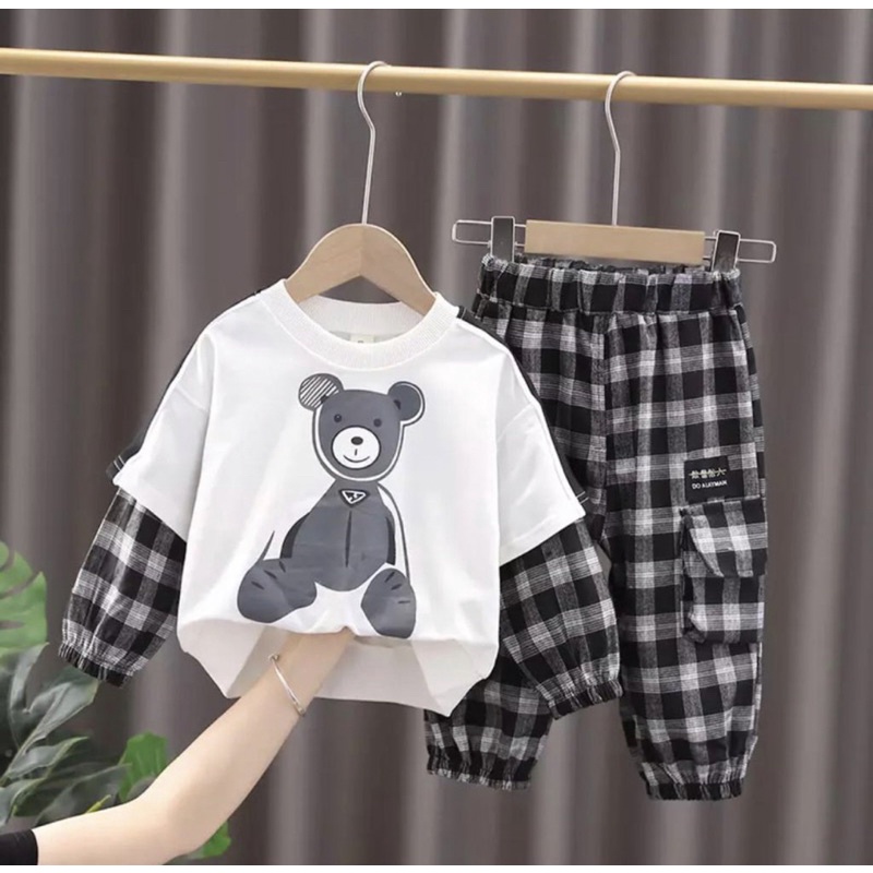 setelan anak baju dan celana anak laki laki motif panda celana kotak kotak 1-5 tahun