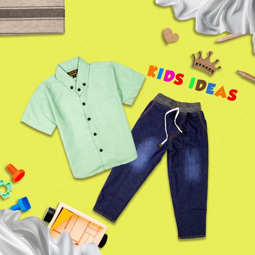 Setelan Anak Laki Baju Kemeja Lengan Pendek dan Celana Panjang Jeans konveksi Aji