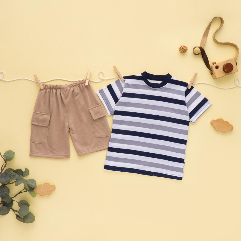 Setelan Anak Kaos Salur Stripe Dan Celana Cargo Usia 1-5 Tahun