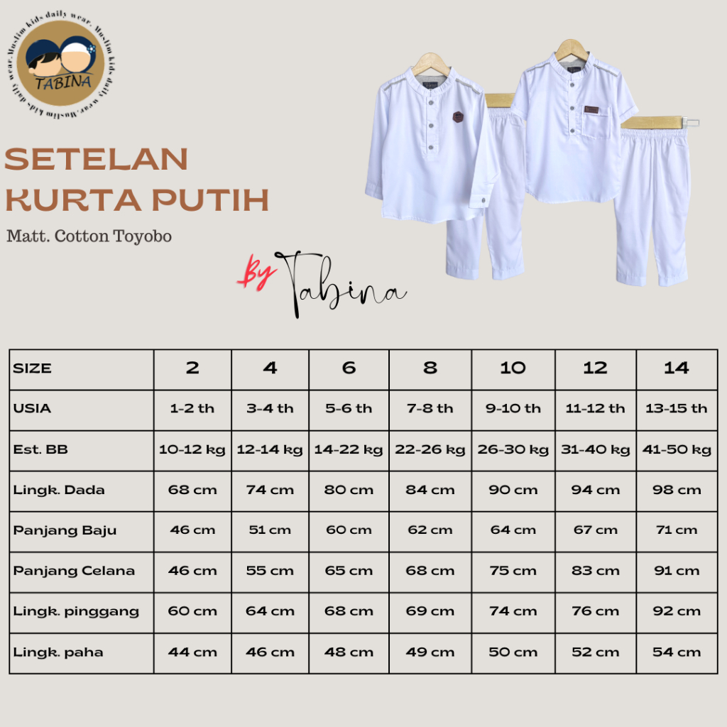 Setelan Koko Kurta Putih Lengan Panjang Anak Laki-Laki Tabina Seri Attar Usia 1 Hingga 16 Tahun