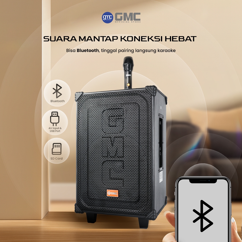 GMC Speaker 883L – Speaker Karaoke Bluetooth 10” – 115W, Gratis Mic Wireless, USB, SD, AV In