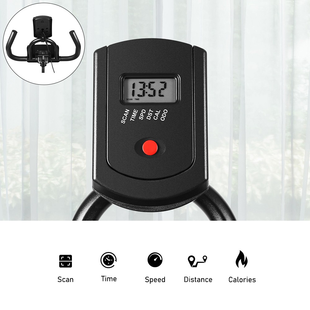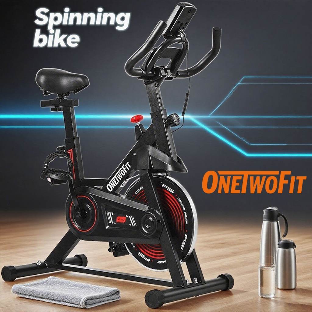 Onetwofit Sepeda Statis Fitness Spinning Bike Hitam & Merah Dengan Monitor Lcd Ketinggian Kursi Adjustable Dudukan Multi