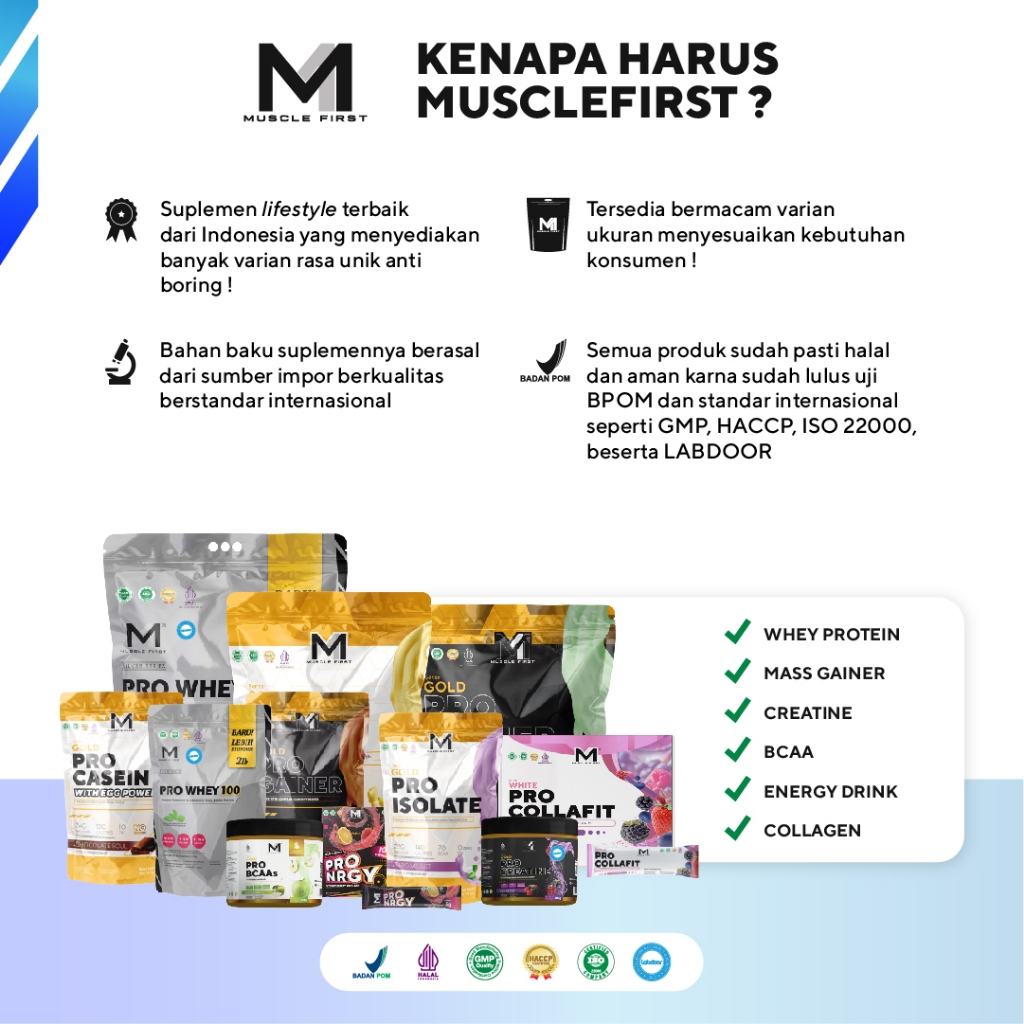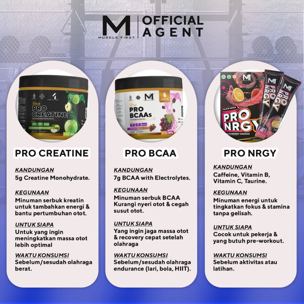 TANPA BONUS, SHAKER, 1 SACHET PRO WHEY, 1 SACHET PRO ENERGY, 2 SACHET PRO CREATIN, 1 SACHET PRO BCAA