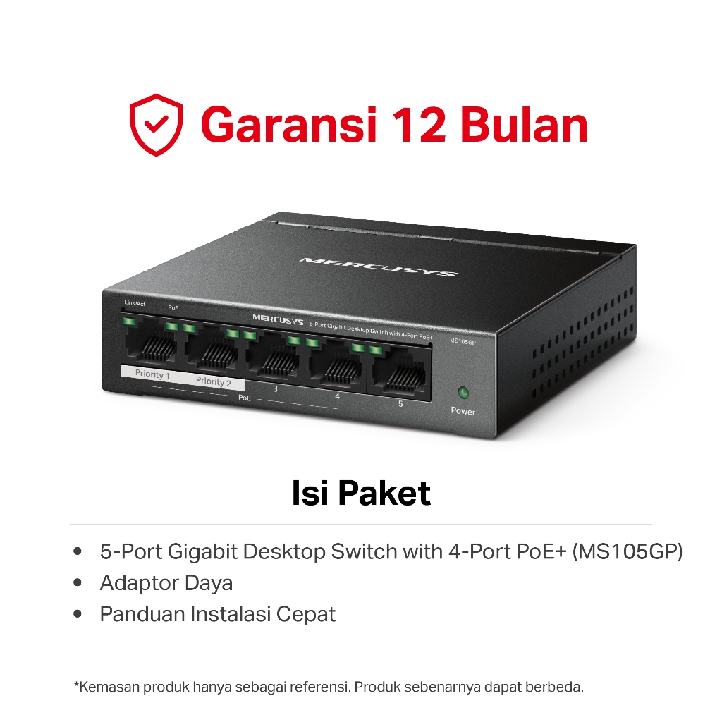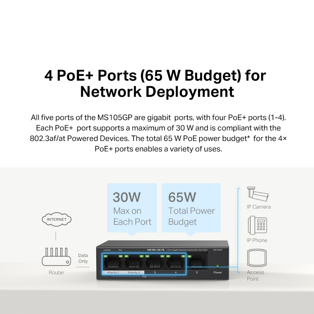 Mercusys | MS105GP | 5-Port Gigabit PoE+ Switch | 65W High Power | 10/100/1000Mbps | Ethernet