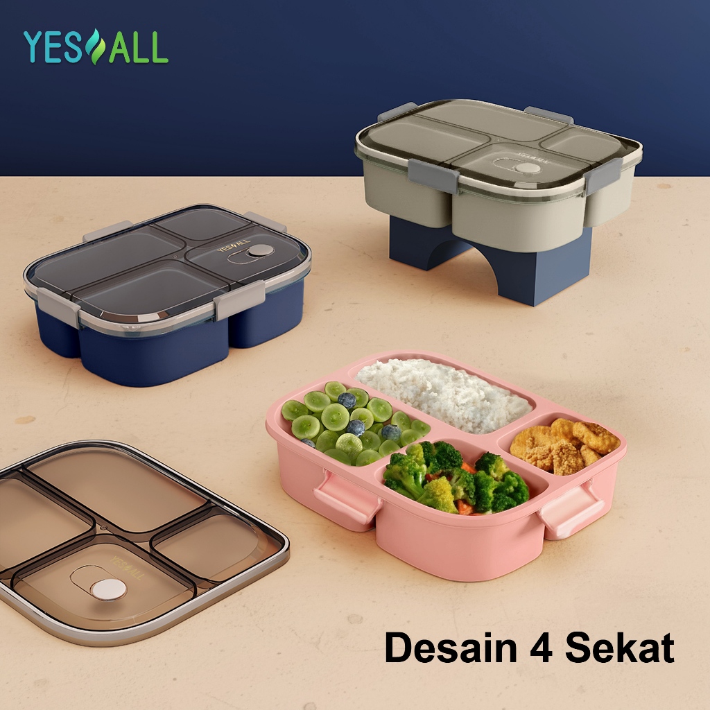 YESALL Lunch Box 1200ml Kotak Makan Bento 4 Sekat Estetik Korea Anti Bocor Sehat Tempat Bekal Makanan – Ocean Blue / Latte Beige / Sakura Pink / Teal Blue / Green / Moca