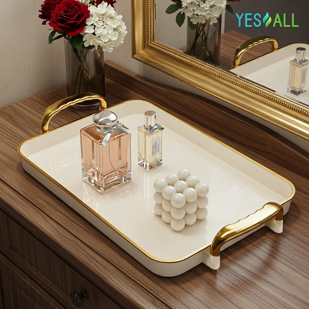 YESALL Nampan Aesthetic Mewah Motif Berlian dengan Pegangan Emas – Tray Plastik Elegan untuk Snack, Buah, Minuman