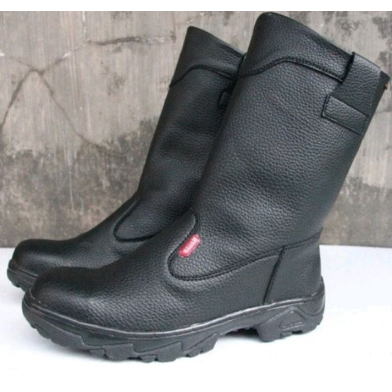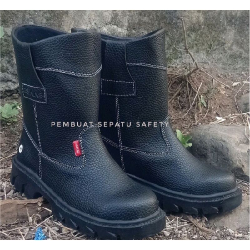 Sepatu Safety Boots tinggi Pria Kulit Ujung Besi Anti Slip Tahan Air Sol Tebal Kerja Proyek Hitam
