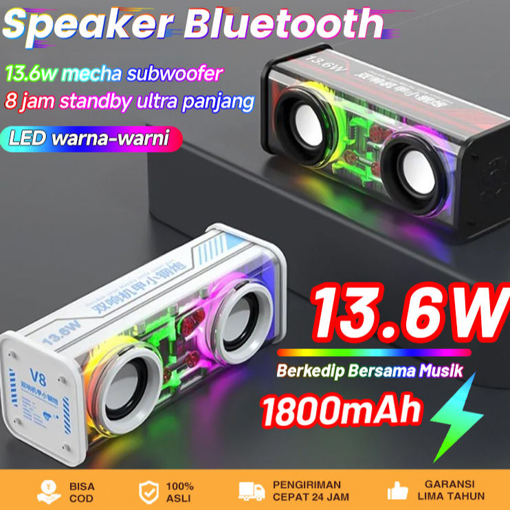Nozu Speaker Bluetooth V8 TWS Double Subwoofer Transparan RGB LED Bass Stereo 13.6W
