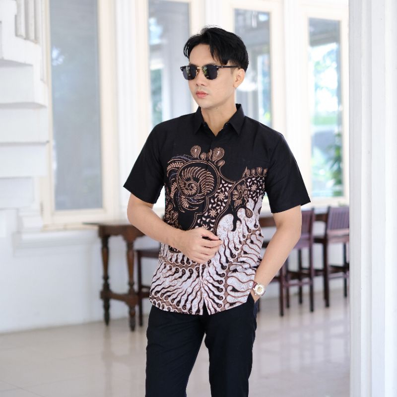 Motif Rangkong Hitam Pendek Kemeja Batik Pria Slimfit Lengan Pendek Baju Batik Pria Hem Batik Pria Jumbo
