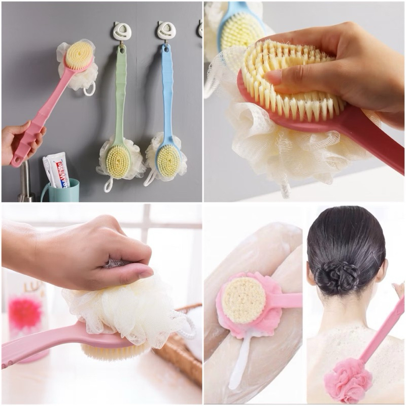 Sikat Mandi Gosok Dua Sisi Spon Bulu Lembut Gagang Panjang Shower Puff Punggung 2 in 1
