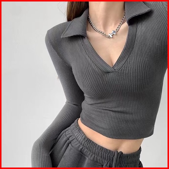 Misshoney V-neck Long Sleeve Ribbed Basic Polo 7304 S M L