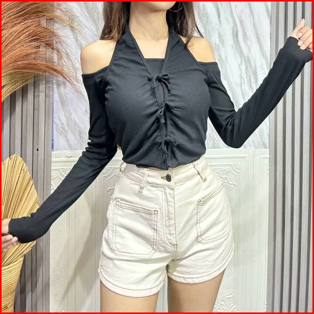 Rx Fashion - Kezia Top Coquette Knit Chery Bow Atasan Halter Satu Bahu Manis Tshirt Lengan Panjang -pn