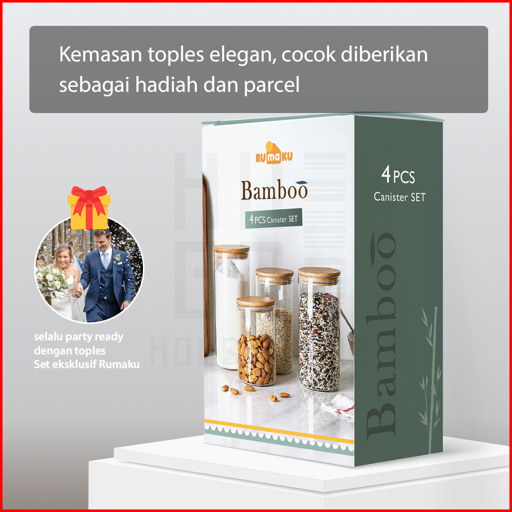Hugo Toples Kaca Set 4 Pcs Toples Kue Kering Lebaran Kedap Udara Tutup Bambu Premium Quality Toples Kaca Borosilicate Ta
