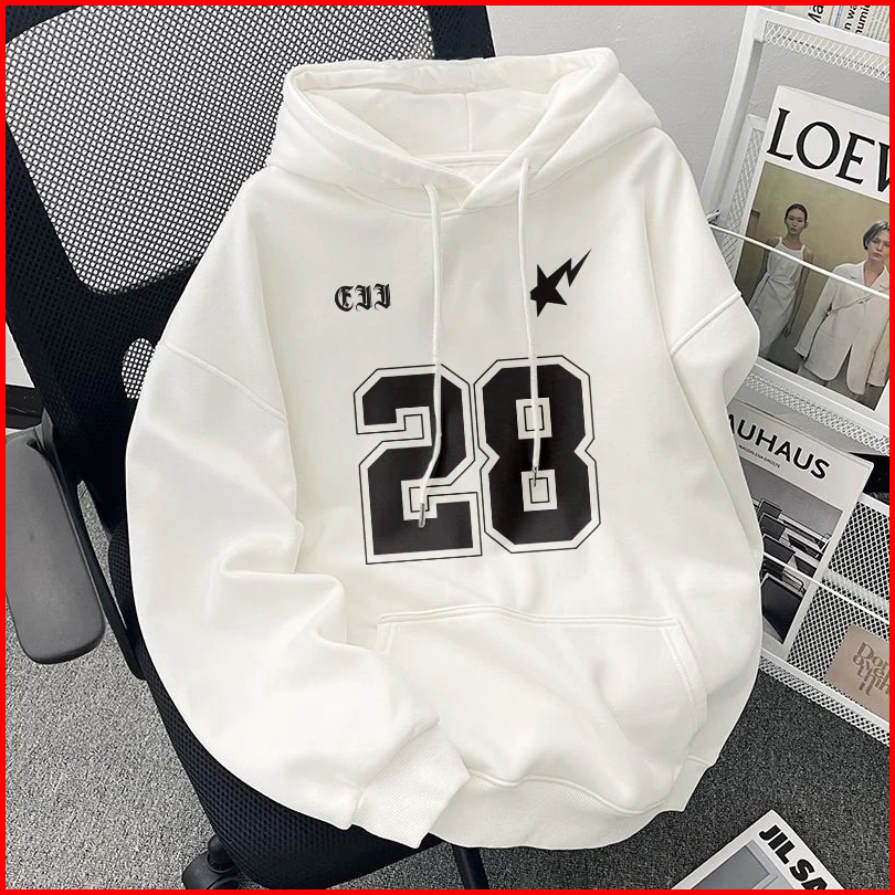Disneay Hoodie Pria Boxy Putih Sweater Hoodie Tren Retro Pola Bintang Petir No.28 Baju Club Keren Sweater Pria Jumbo Hoo