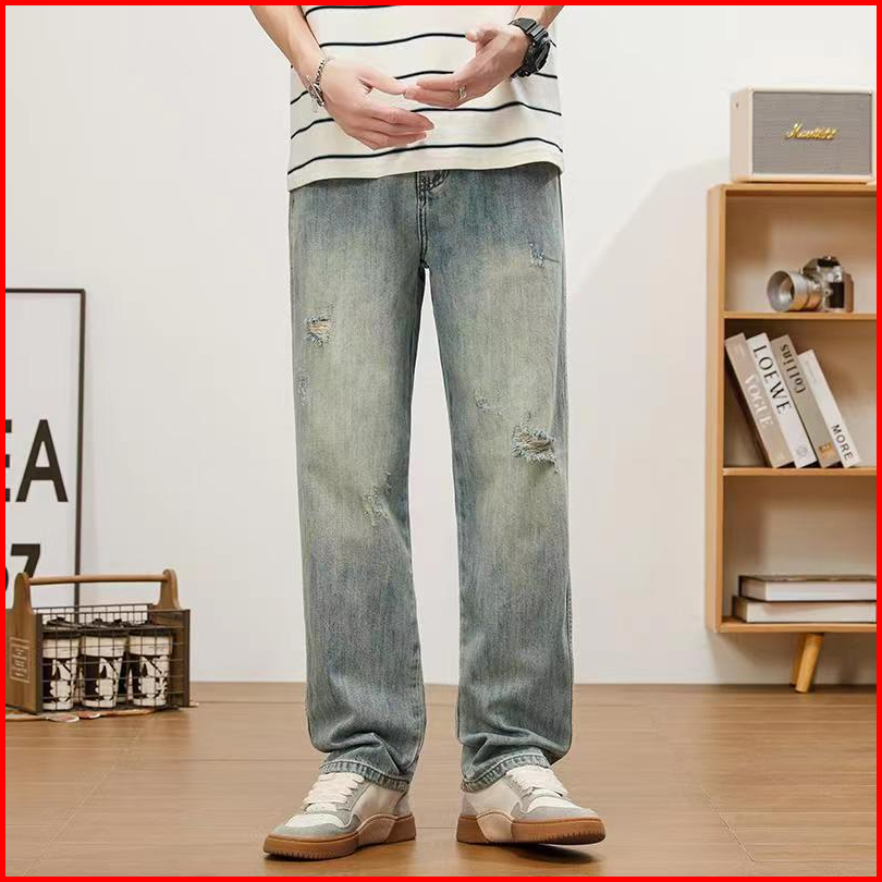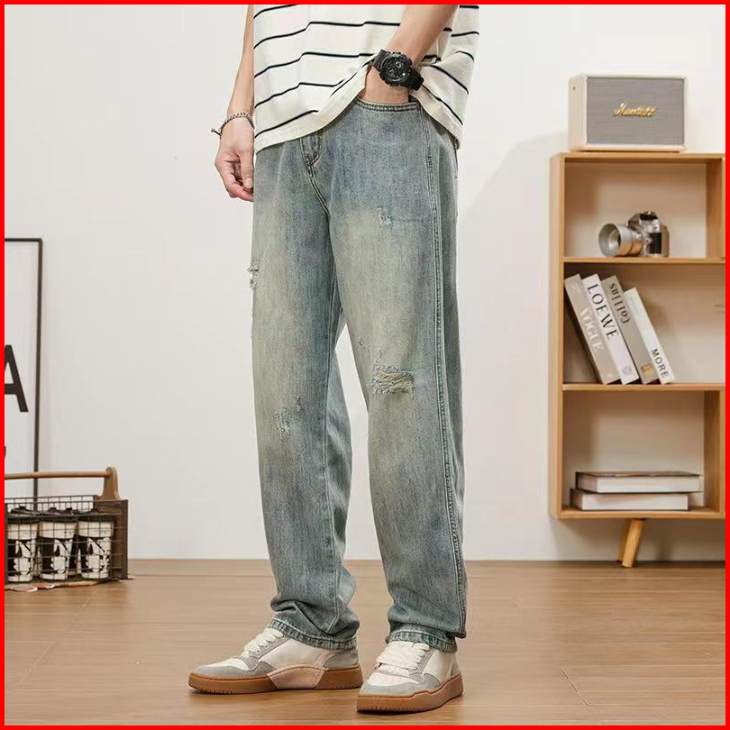 Celana Jeans Pria Sobek Biru Retro Baggy Pants Straight Jins Ripped Panjang Cowok Celana Denim Dewasa Laki Laki Loose Fi
