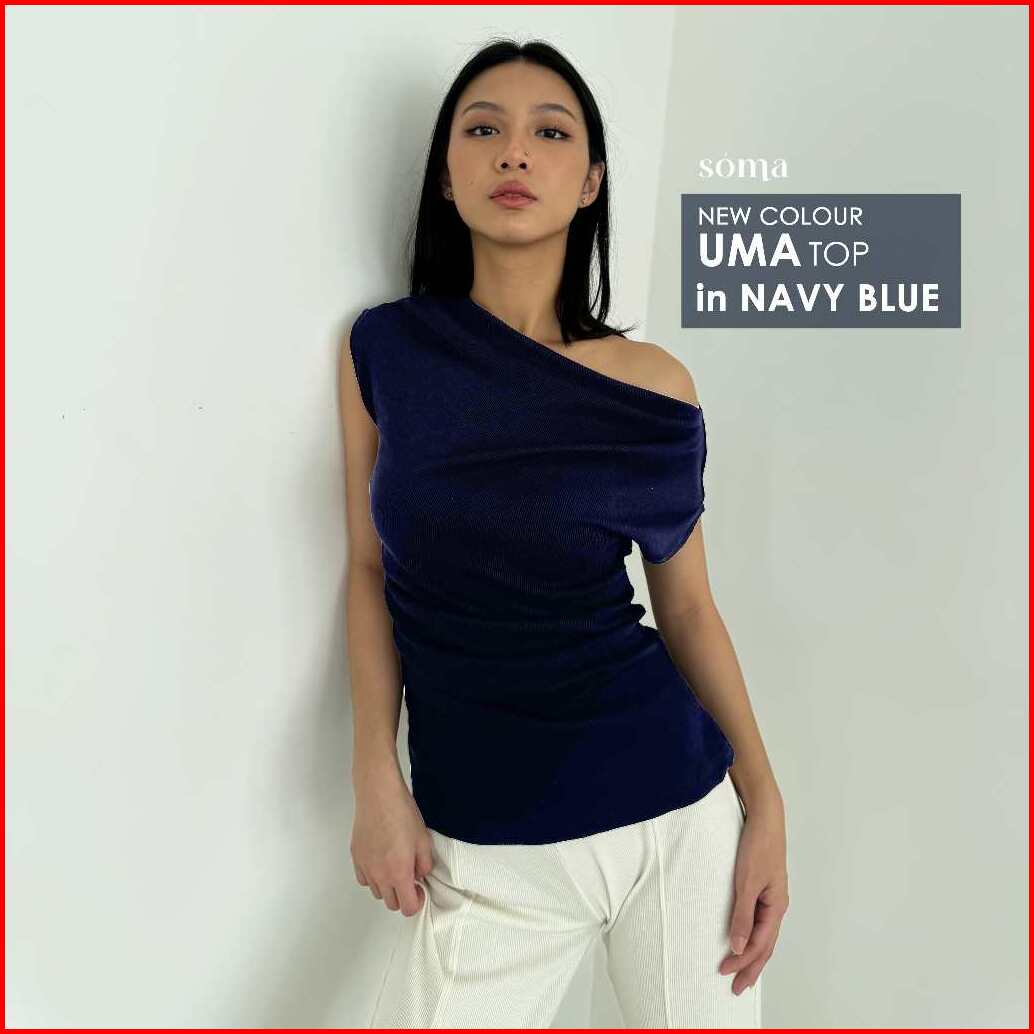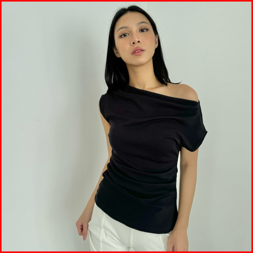 Uma Top Atasan Off Shoulder Knit Wanita Lengan Pendek Ruched Pleated Rample Sabrina Basic One Shoulder Korean Top Summer