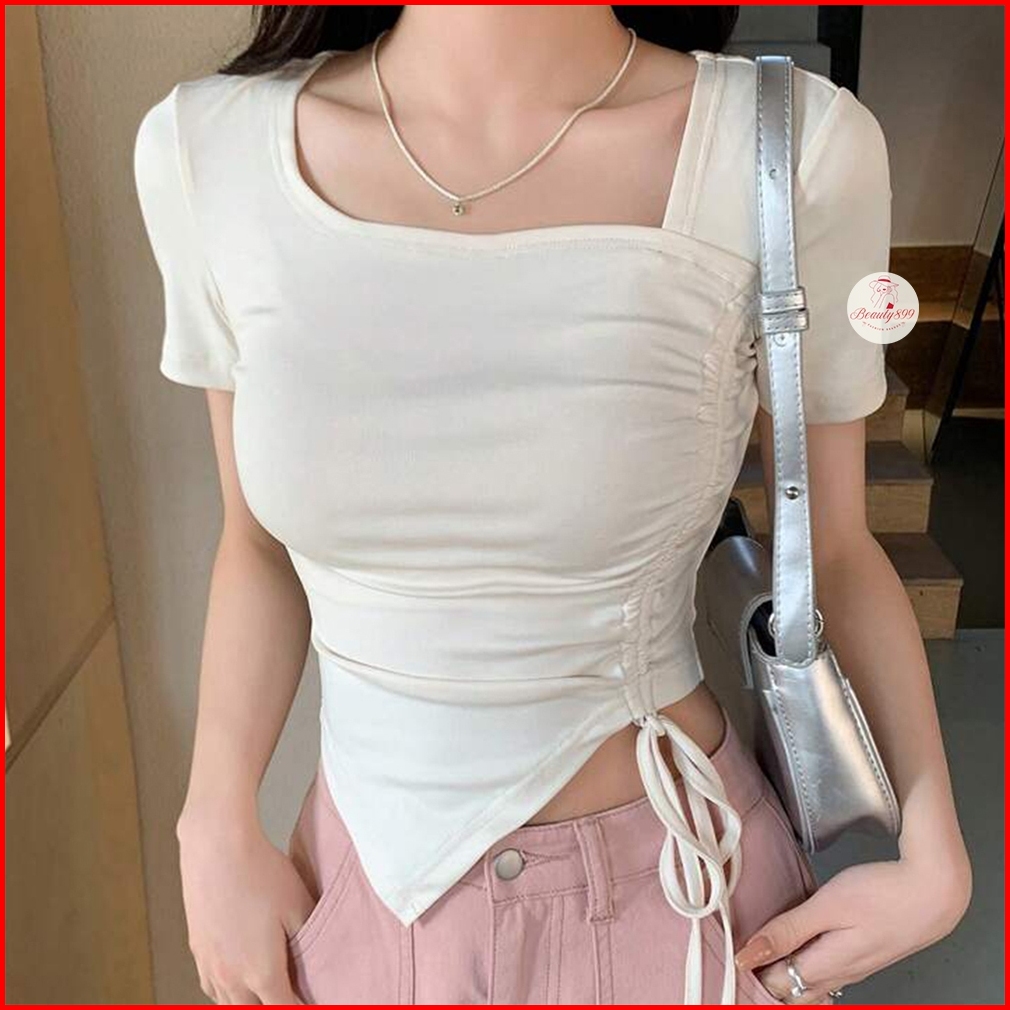 Promo 8.8 Crop Top Square Serut Samping - Atasan Wanita Lengan Pendek Korean Bahan Knit Style 6058