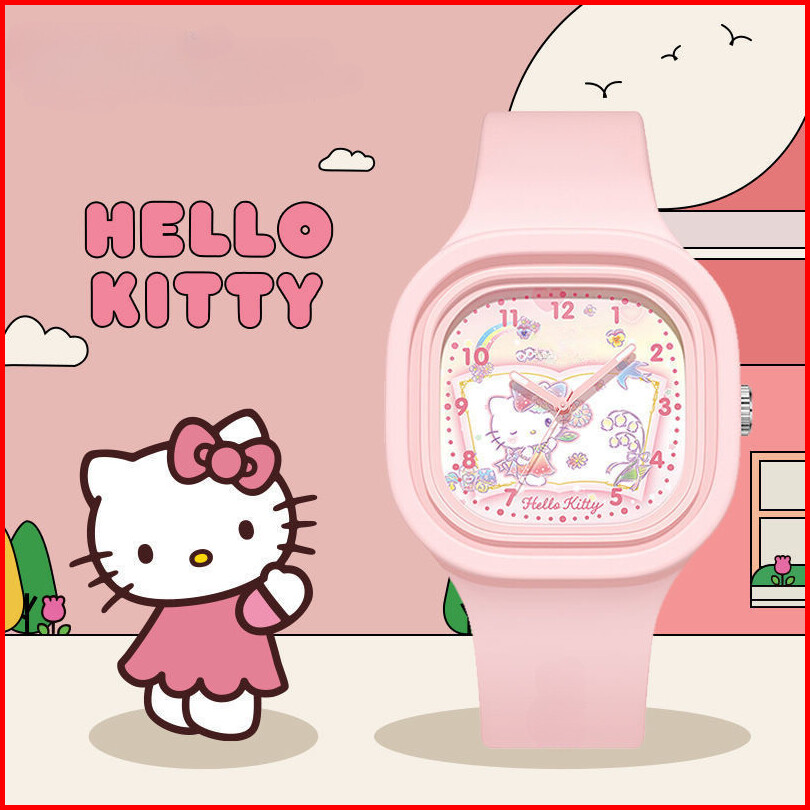 3pcs Jam Tangan Kuarsa Anak-anak Kuarsa Lucu Hello Kitty Square Dial Silicone Dengan Gelang Hadiah Ulang Tahun Dengan Ko