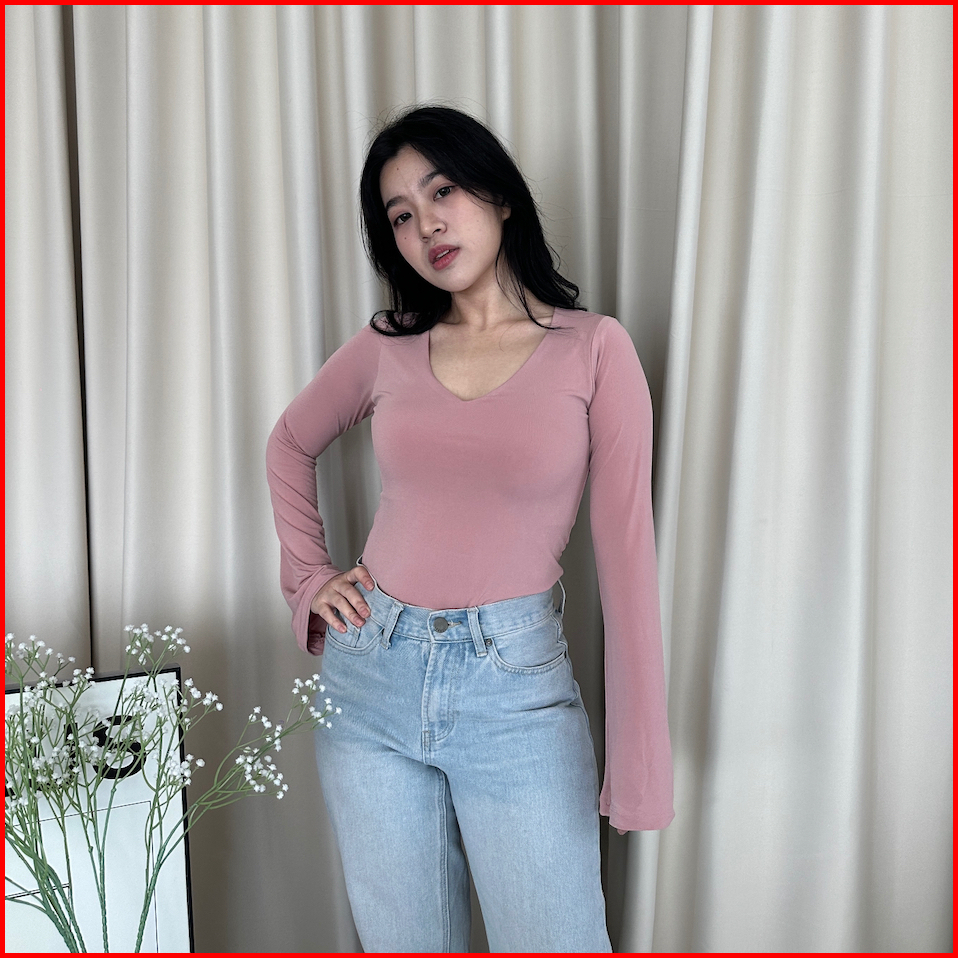 Somethingsweet - Meghan Bodysuit Wanita L Atasan Wanita L Bodysuit Basic Lengan Panjang L Leher V Neck Wanita Flute Slee