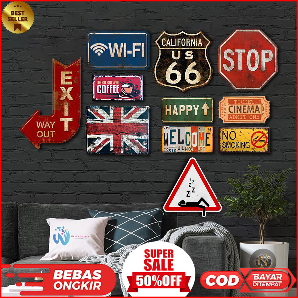 WiFI, TICKET, ROUTE 66, EXIT, STOP, WELCOME, HAPPY, NO SMOKING, INGGRIS, COFFE, EXIT V2, FRENCH FRIES, EAT HERE, EXSPRESSO, INCREDIBLE LOVE, DADS GARAGE, YOU CAN STOP ME, STUPID PEOPLE, COFFE SHOP PAKET, ROUTE 66 V2, EXIT V3, WARNING RETRO PAKET, AREA 51, BUNDLING(FREE PARFUM, PAKET CINEMA, COUSTEM DESIGN 20x30