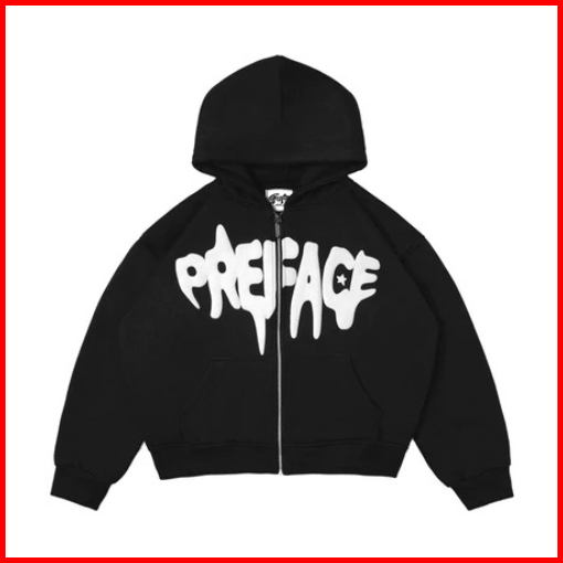Hoodie Zipper Boxy Preface Teks Flong Simple Hoodie Vintage Casual Pria Wanita