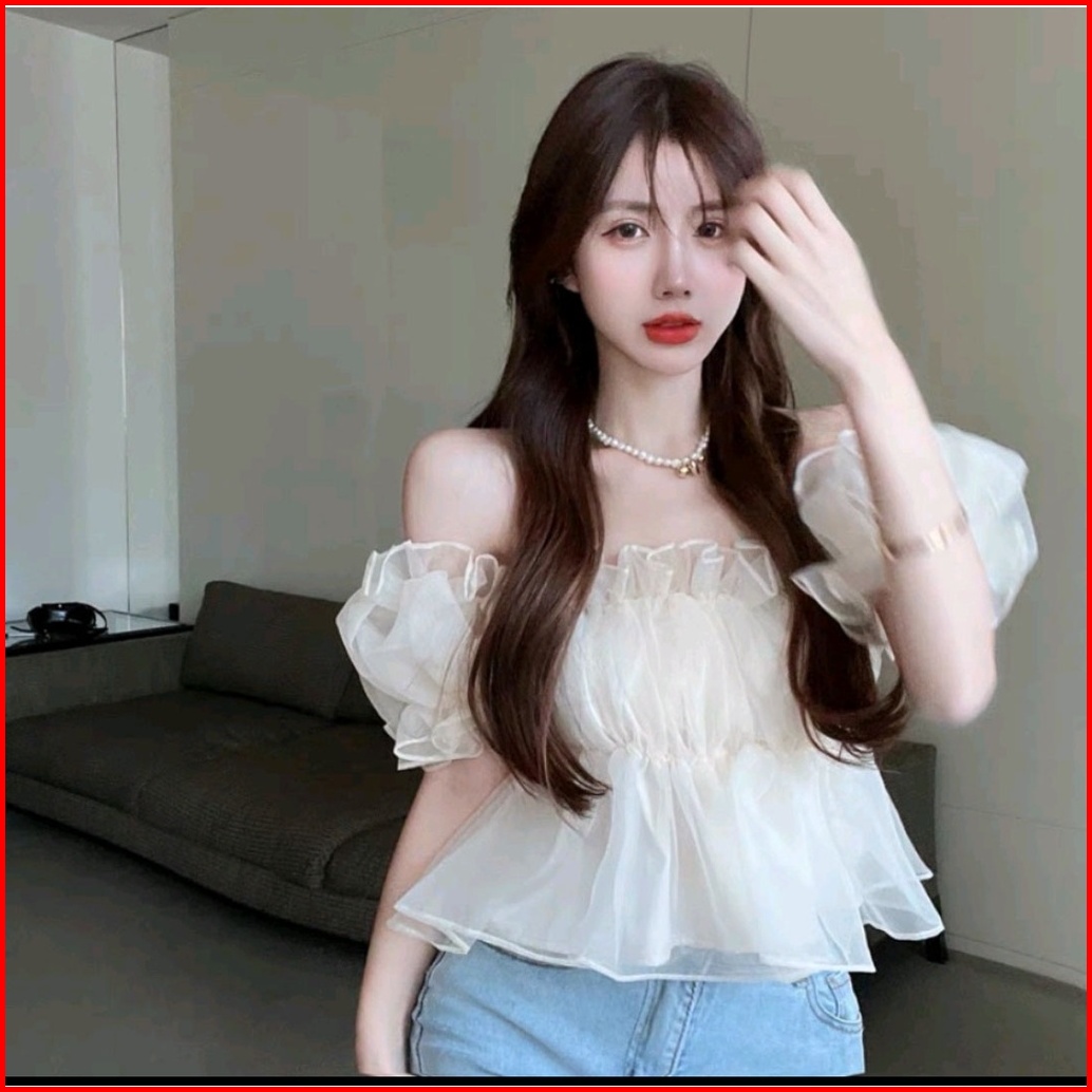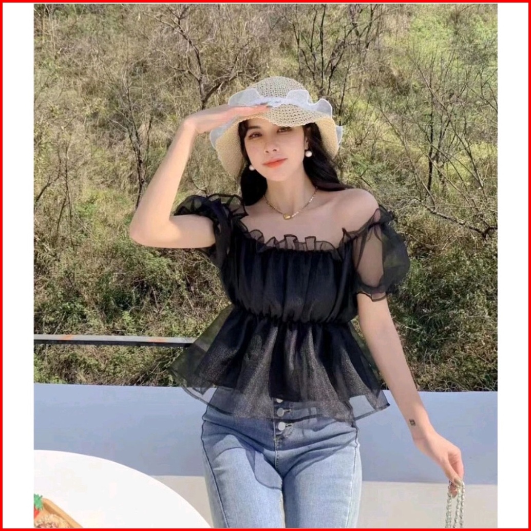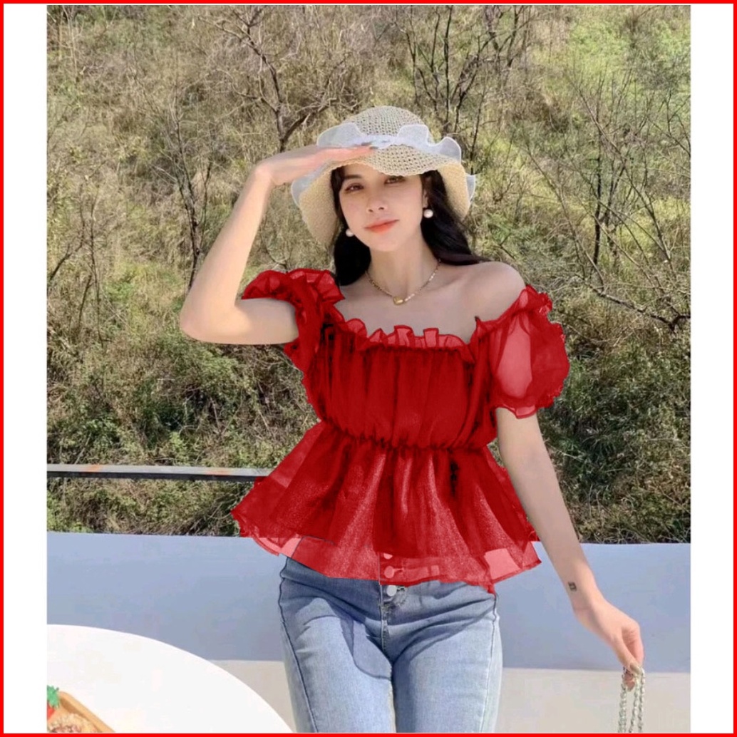 Atasan Wanita Sabrina Bahu Terbuka Lengan Pendek Bahan Organza 930