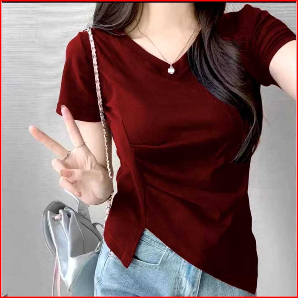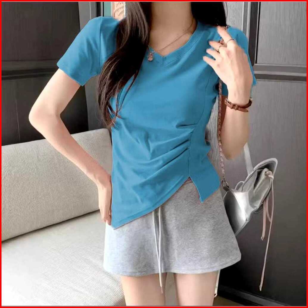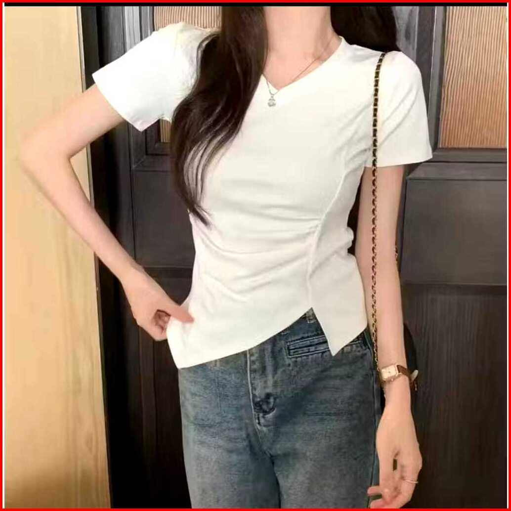 Fd Fashion Kaos V-neck Lengan Pendek Lipatan Slit Asimetris Samping Kaos Atasan Wanita Korean Kekinian 6065
