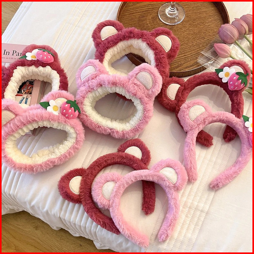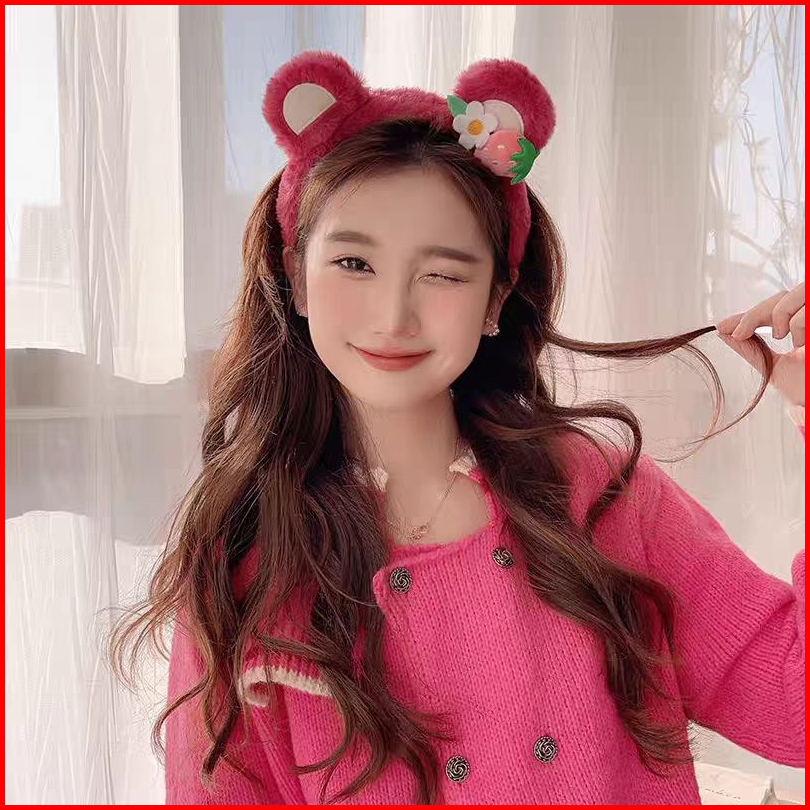 Bando Lotso Karakter Telinga Bear Lucu Korea Beruang Stroberi Headband Bandana Ikat Kepala Mewah Cuci Muka Wanita Hiasan