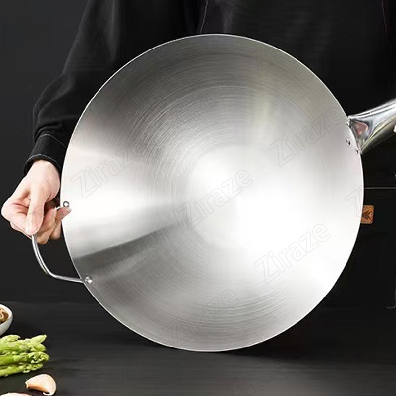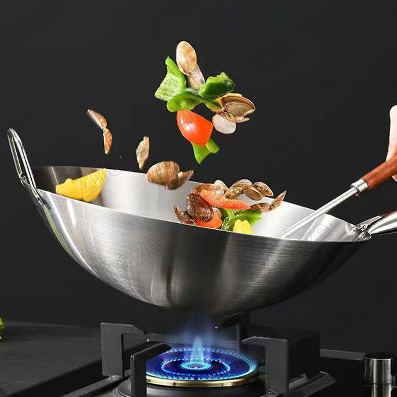 30/32/34/36cm Baja Tahan Karat Wajan Penggorengan Dengan Gagang Kayu Kuali Wajan Stainless Steel Seasoning Wok Anti Leng