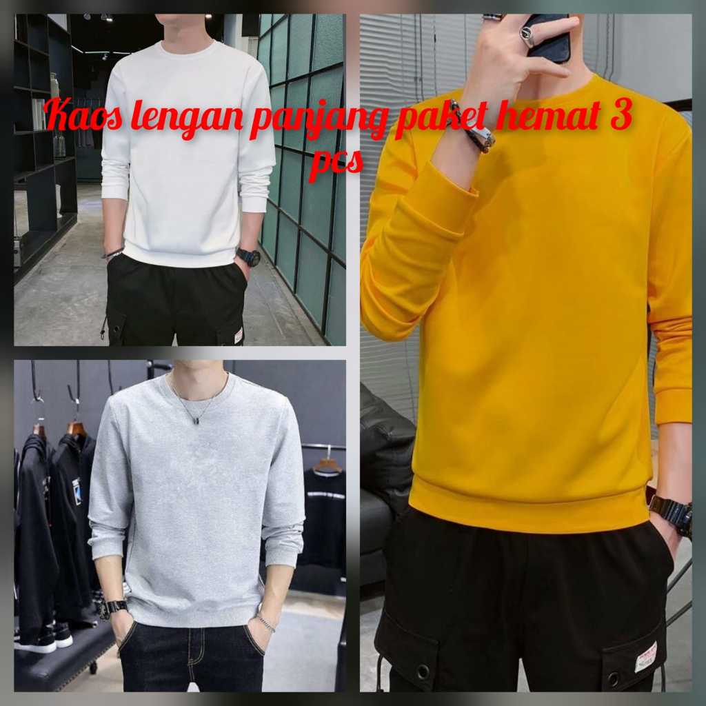kaos lengan panjang polos paket hemat 3 pcs/ sweter rib pria/ baju polos