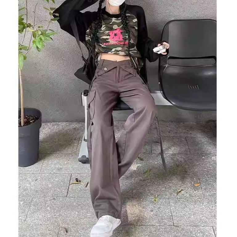 kekinian abu cargo original highwaist loose kasual cargo jeans wanita