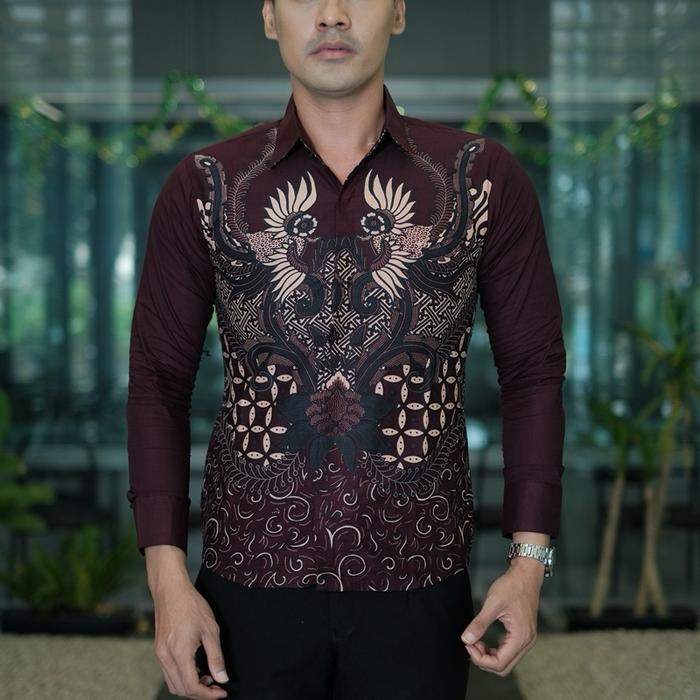 BATIK NINGRATAN MOTIF PRABUWIRA BURGUNDY MAROON KEMEJA BATIK PRIA PREMIUM LENGAN PANJANG SLIMFIT LAPIS FURING KATUN PRIMA HALUS DAN ADEM ANAK MUDA KEREN - S