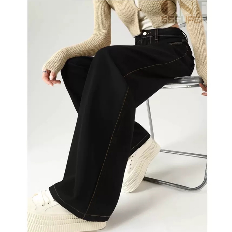 S-6XL Celana Jeans Wanita Pinggang Tinggi Berkobar Hitam Sedikit Berkobar Celana Kaki Lebar Lurus