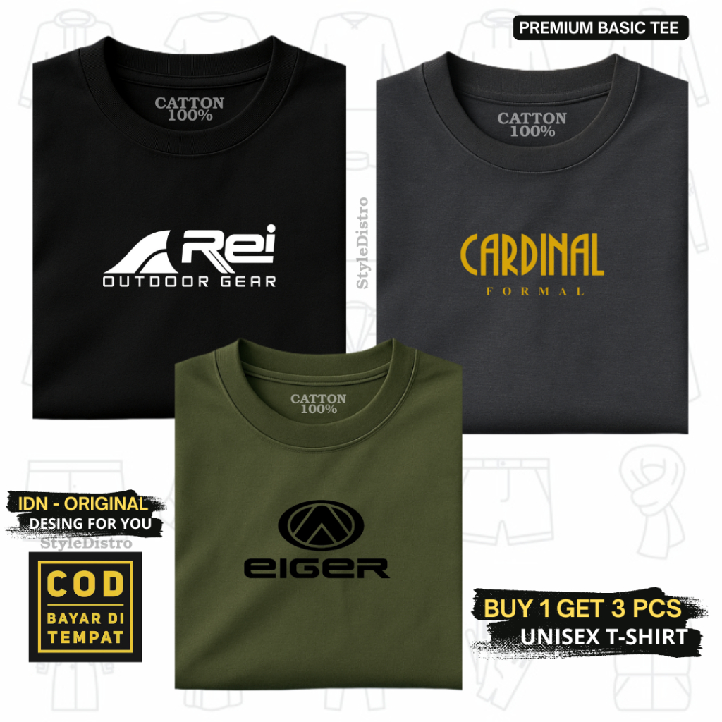 Paket 3 Pcs Kaos Distro Premium Pria T-Shirt Lengan Pendek - REI Putih - CARDNL goId - EIG O Hitam