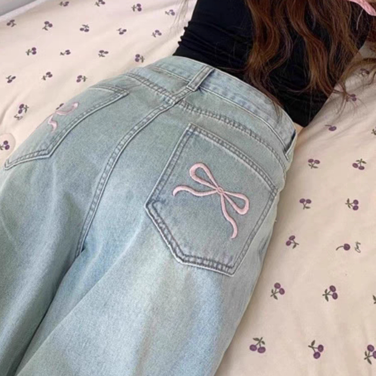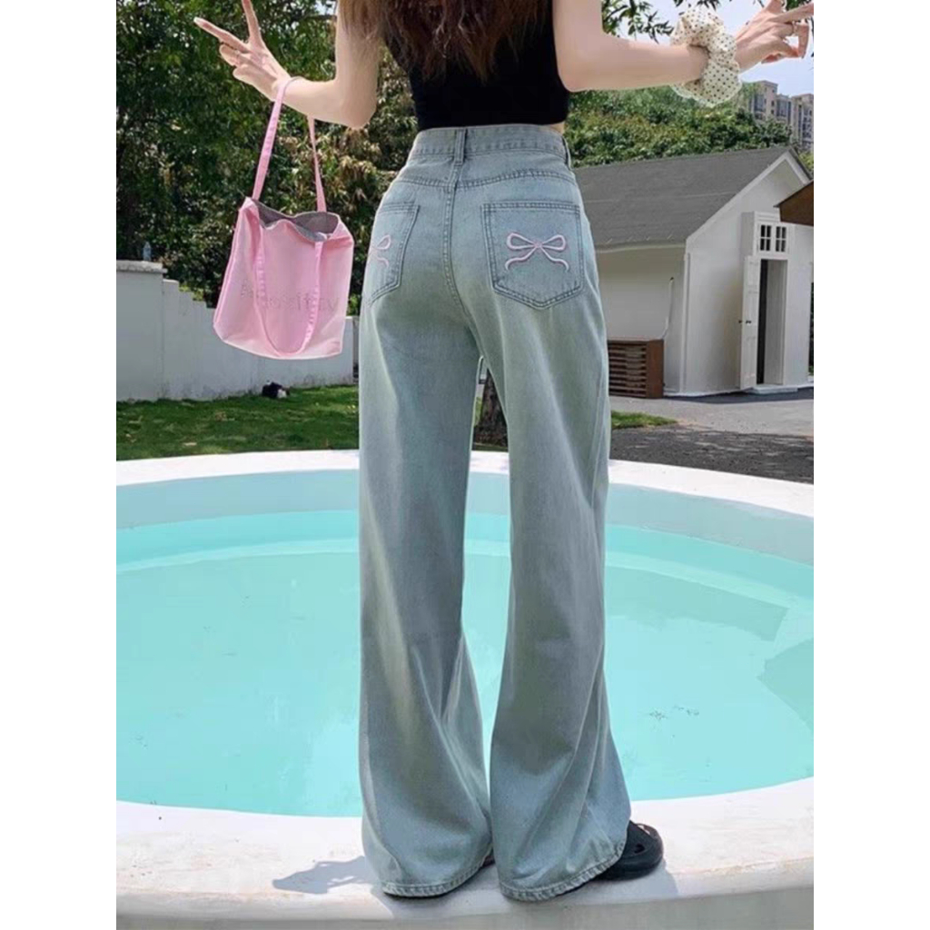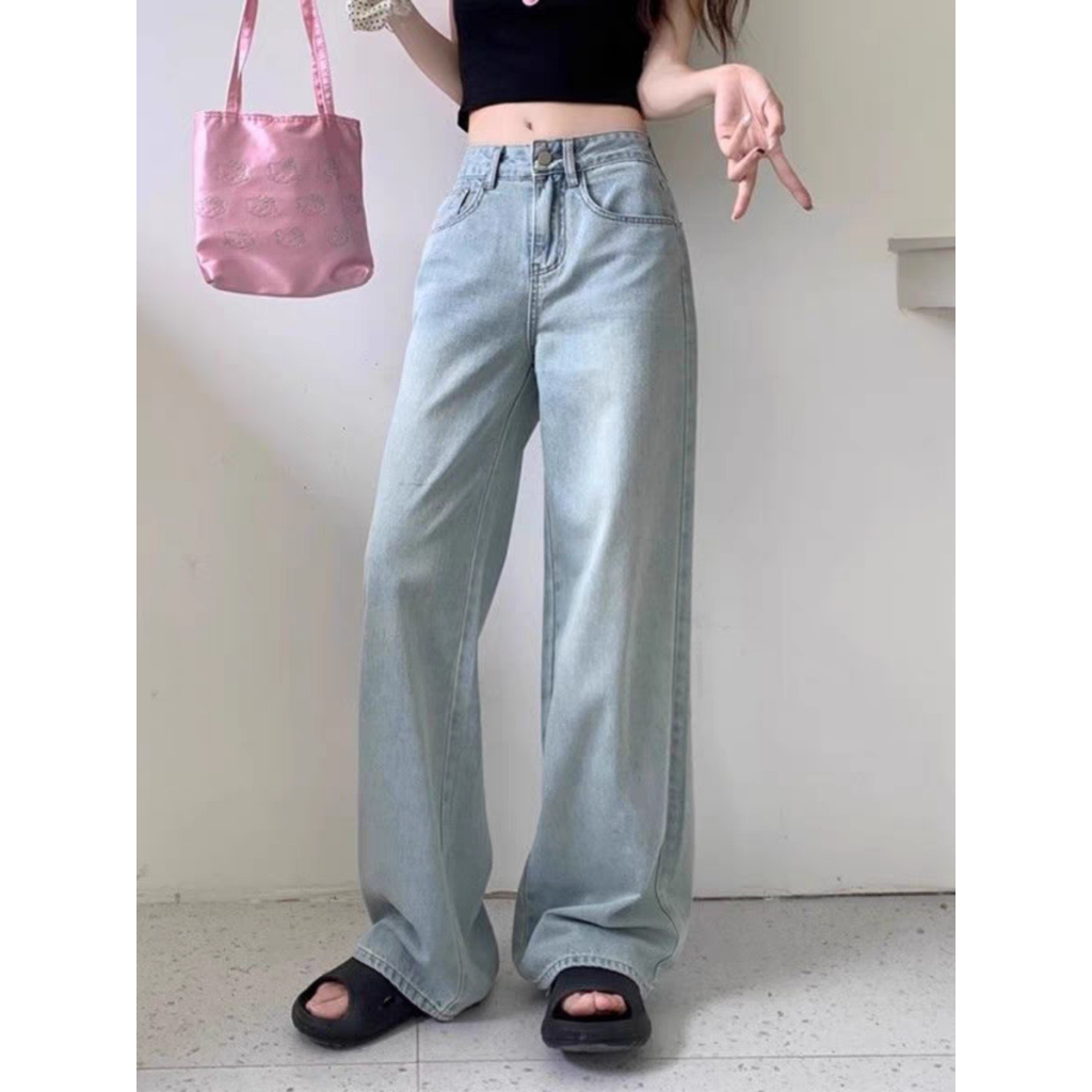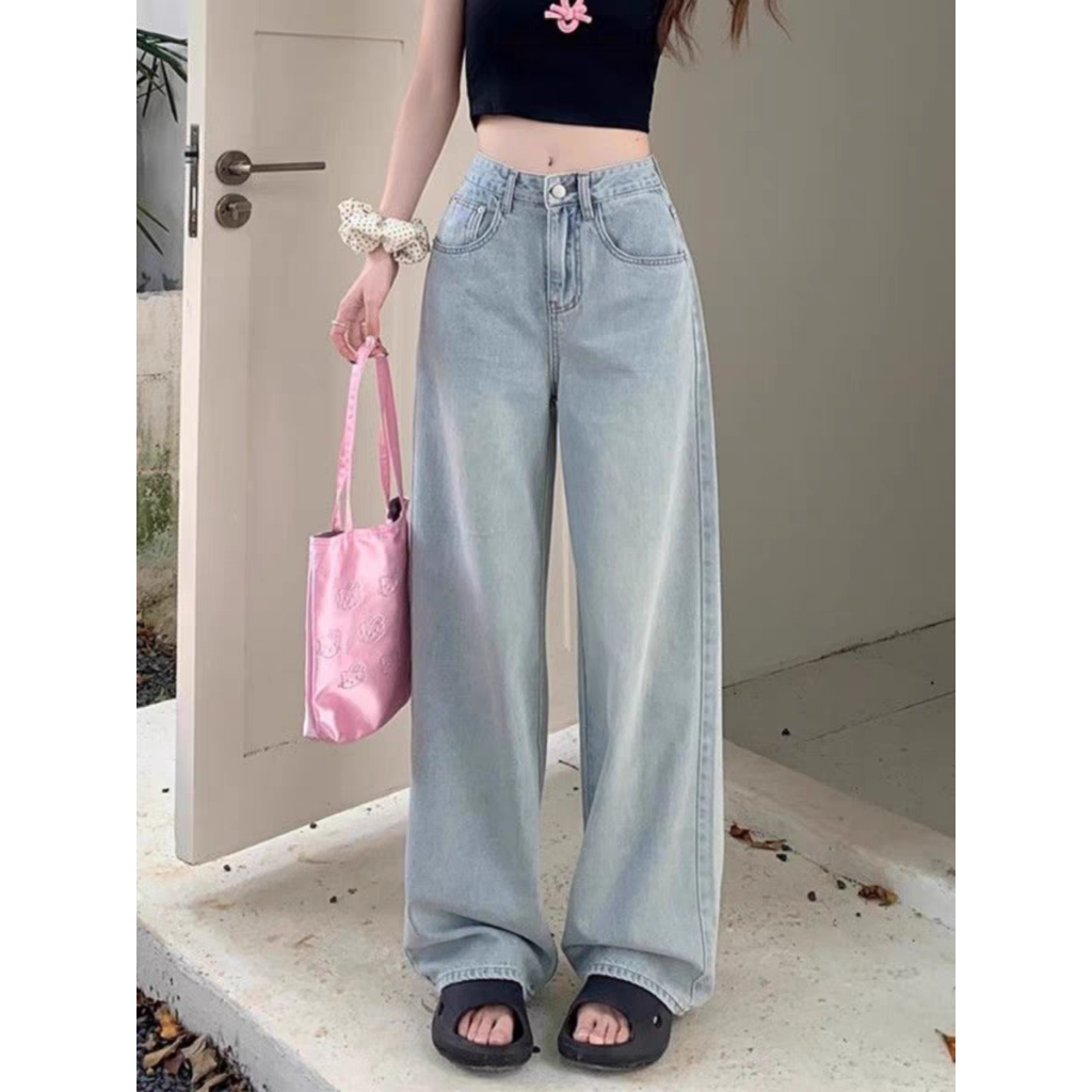 Jeans Biru Muda Sederhana Gaya Korea Untuk Wanita Pinggang Tinggi Kaki Lebar Longgar