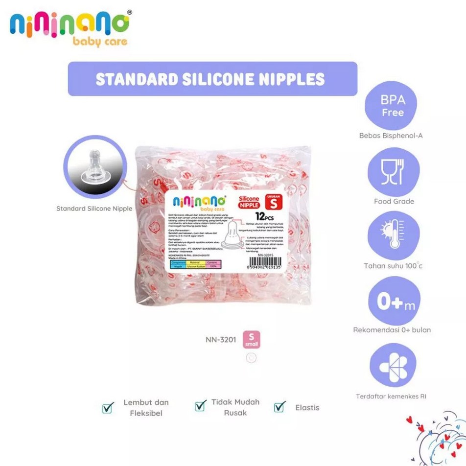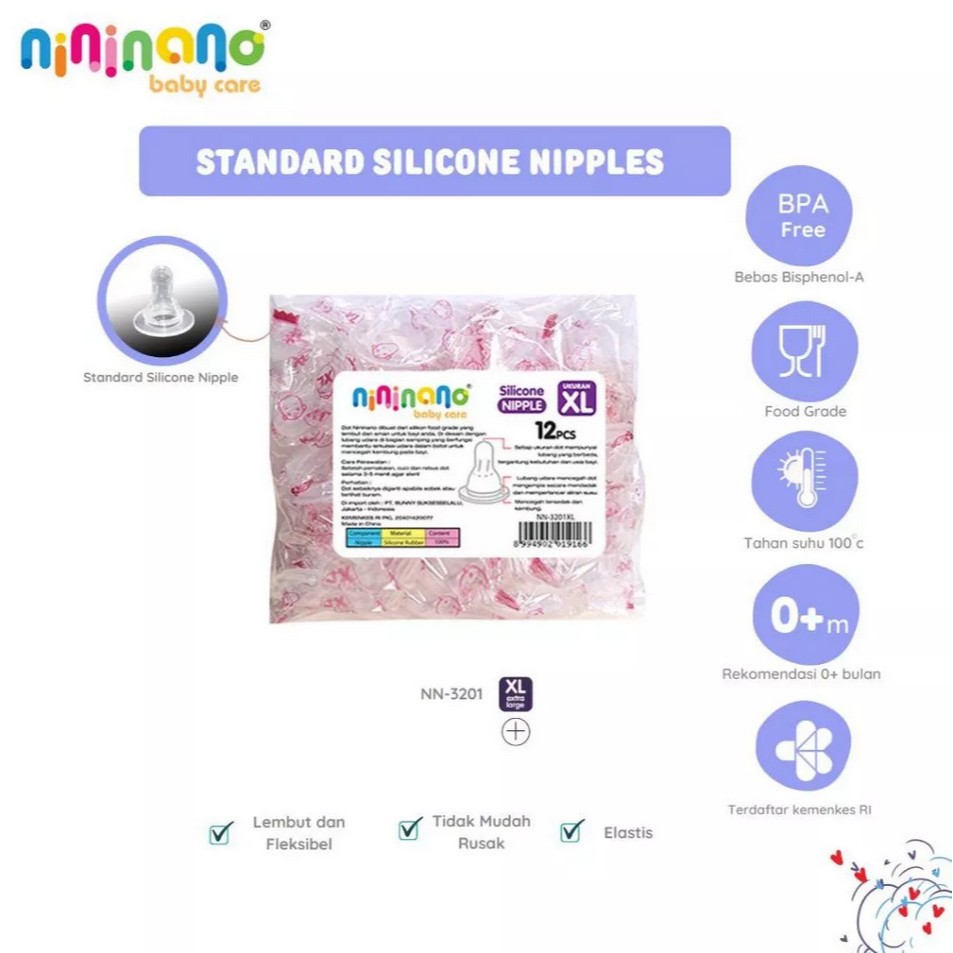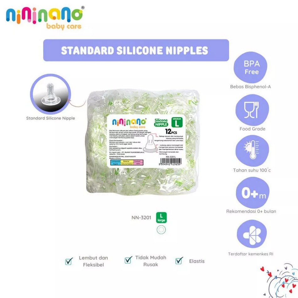 Isi 12 Nini Nipple Dot Botol Anak Bayi Standard Neck Silicone Karet S, M, L, XL BPA Free