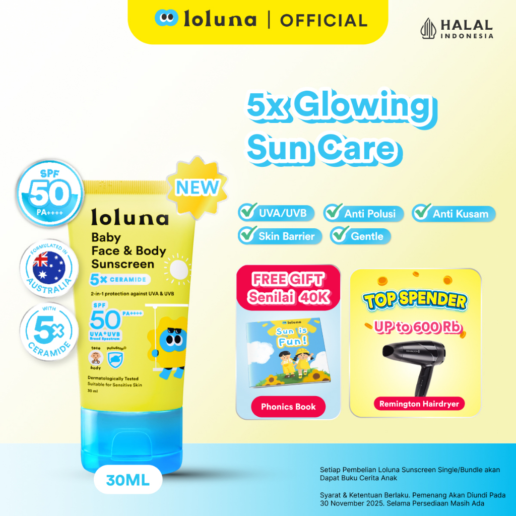 Loluna Baby Face & Body Sunscreen 30ml SPF 50+ PA++++ dengan 5x Ceramide & Niacinamide - Proteksi Lengkap UVA UVB, Anti-