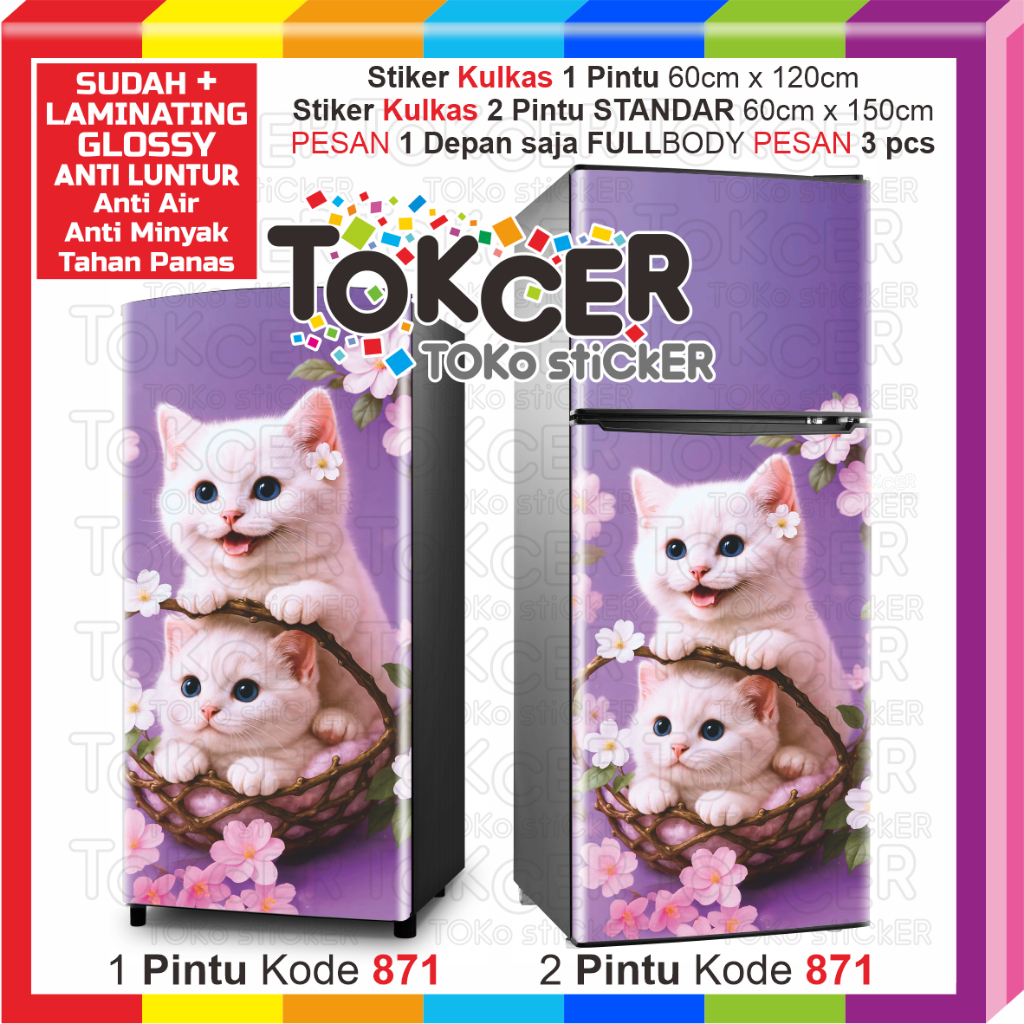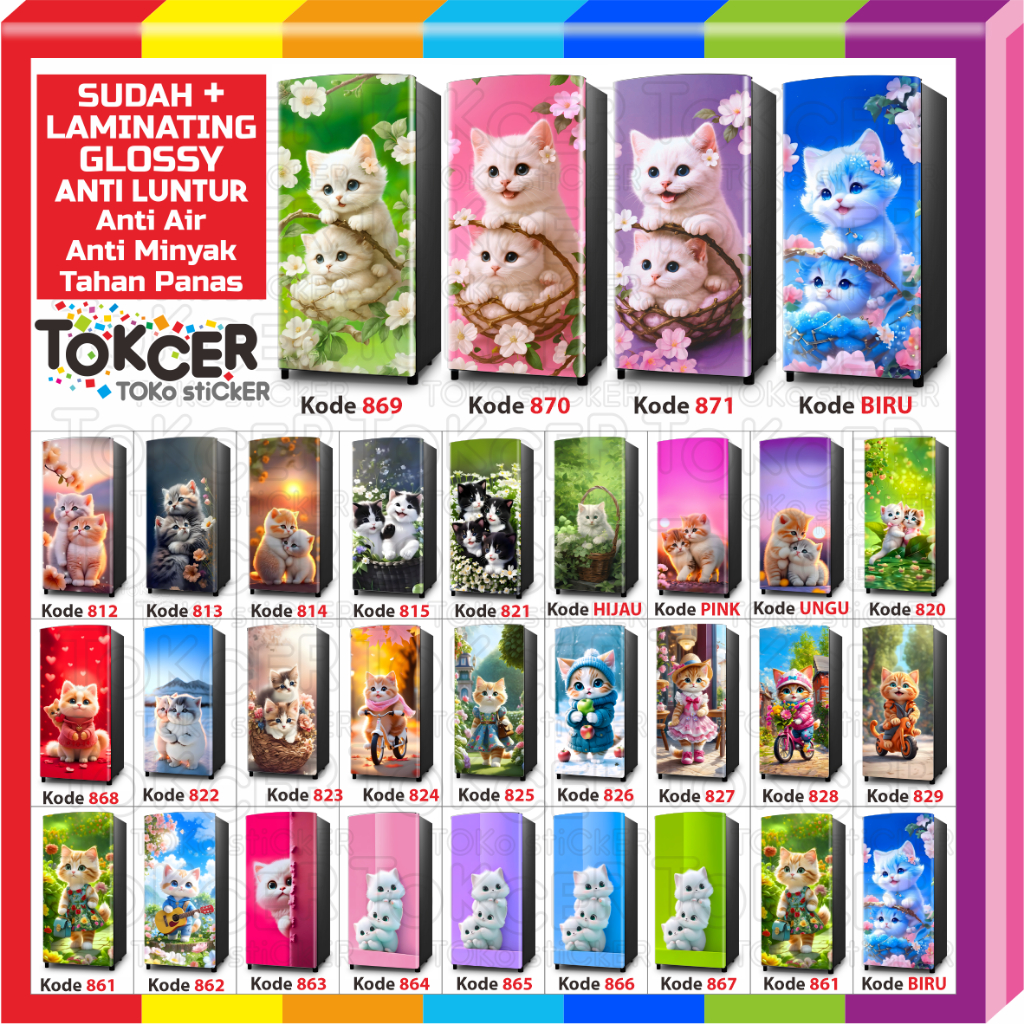 STIKER Kulkas LAMINATING GLOSSY Anti LUNTUR uk 1 Pintu atau 2 Pintu Motif KUCING