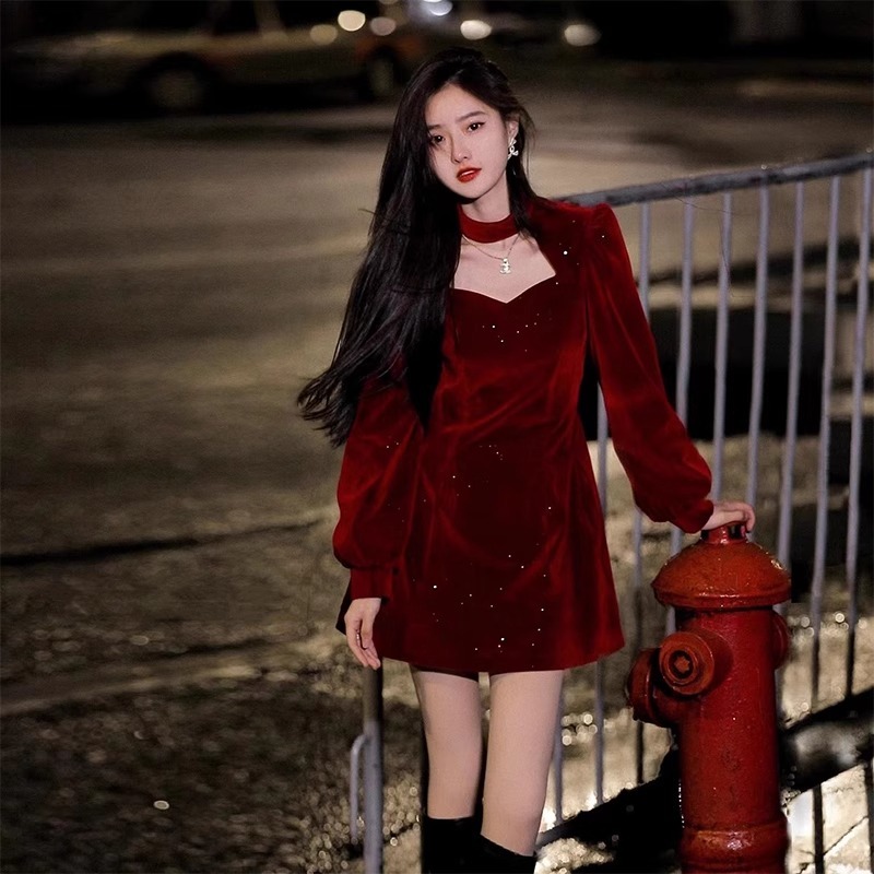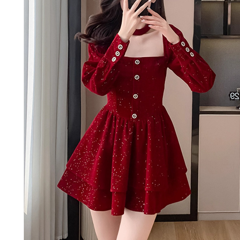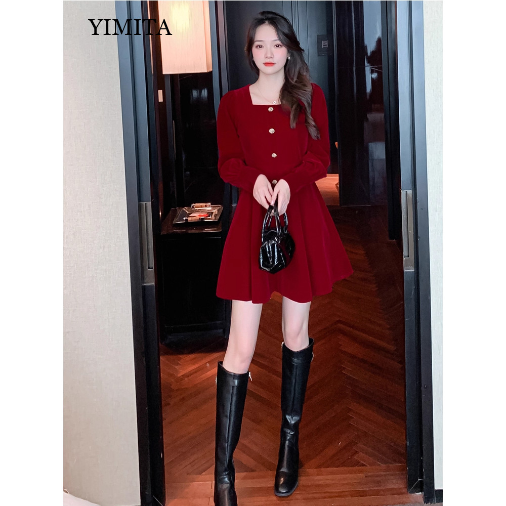 YIMITA dress merah wanita kekinian korean long sleeve square neck christmas party dress natal terbaru 2025
