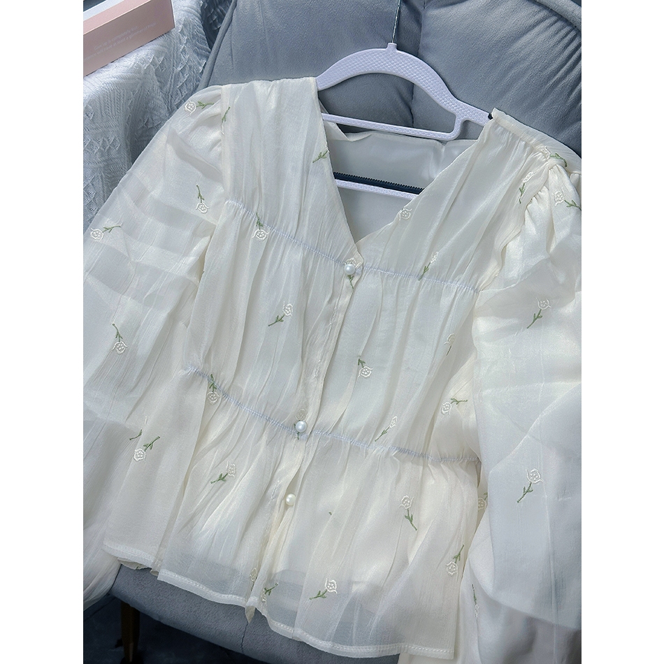 BLUS SIFON LENGAN PANJANG GAYA RETRO BAJU ISTANA BORDIR PINGGANG LENTERA LENGAN KEMEJA LENGAN BALON