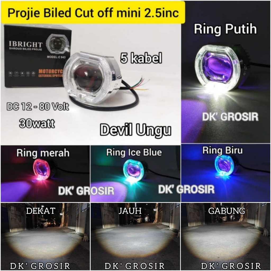 TERLARIS IBRIGHT C943 - Projie Biled Cut Off mini 2.5 INC Jauh Dekat 30watt plus devil ungu 5 kabel C943