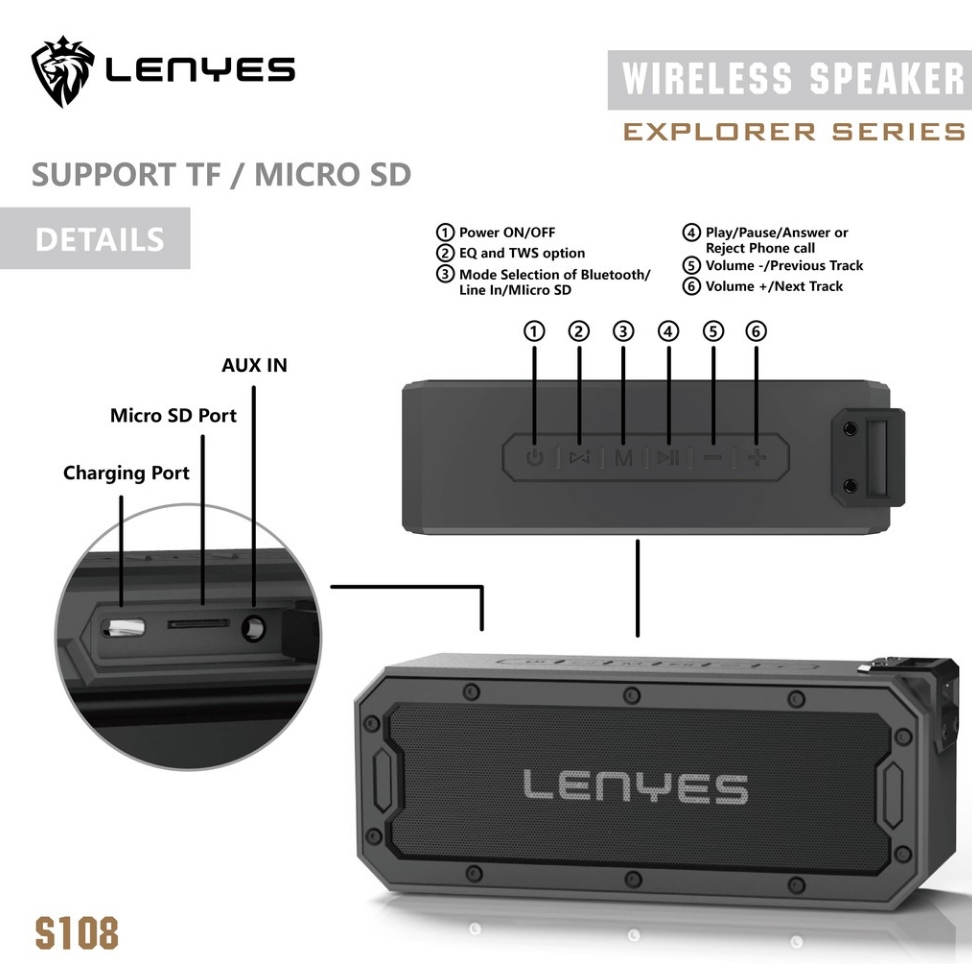 LENYES SPEAKER BLUETOOTH TWS V5.0 SHOCKPROOF AND WATERPROOF IPX7 40WATT HIFI STEREO S108