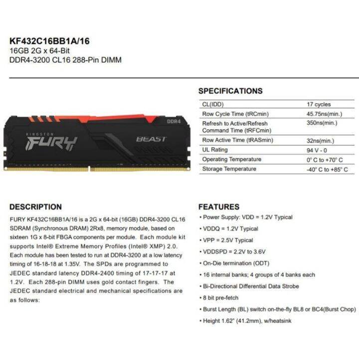 Kingston Fury Beast RGB DDR4 RAM 8GB 16GB RAM PC4-21300 DIMM memory 2666MHz 3200MHz PC Gaming Memory 288pin with RGB Lig