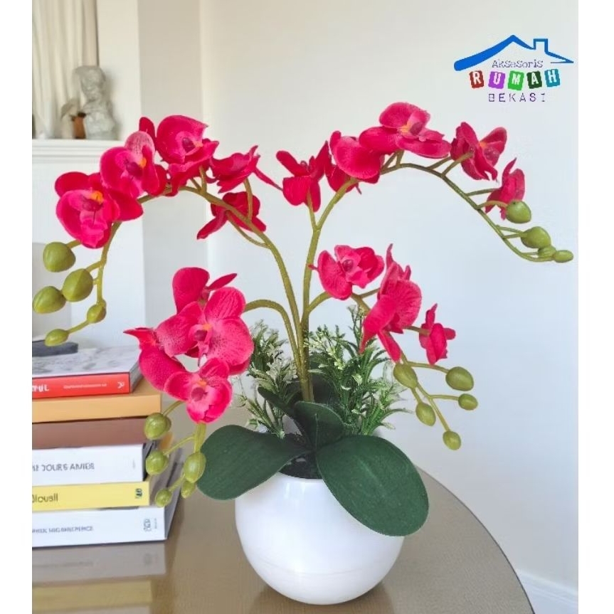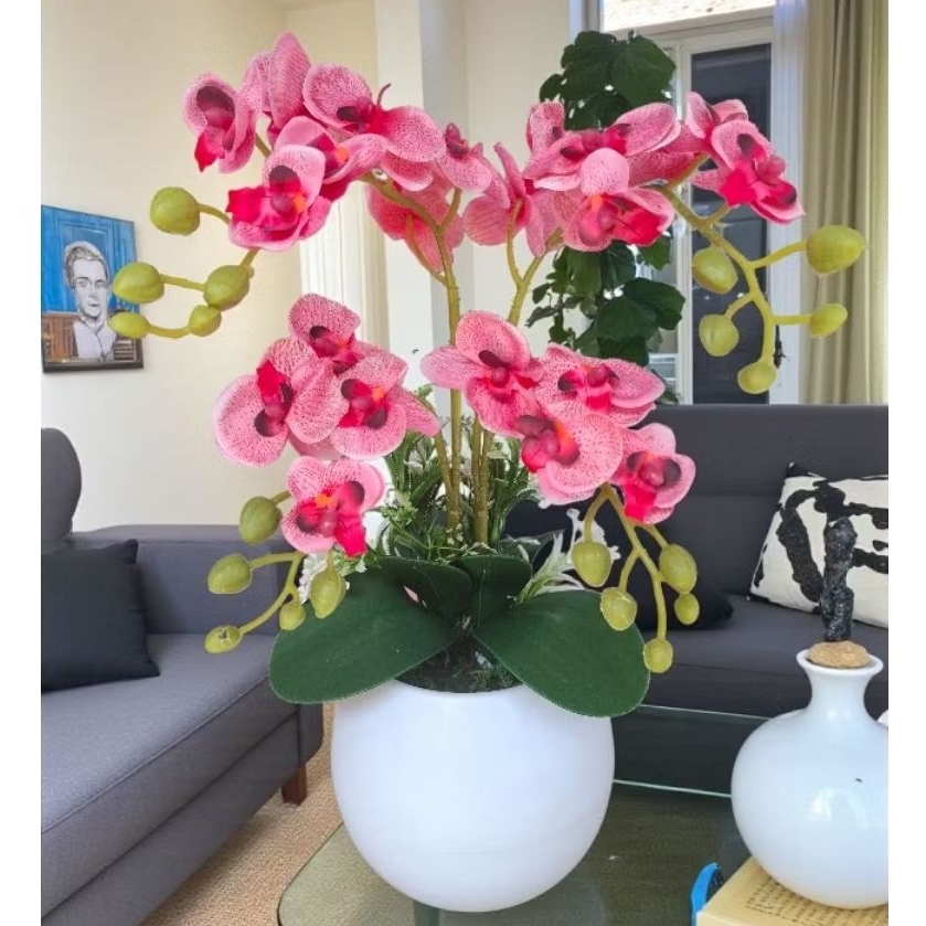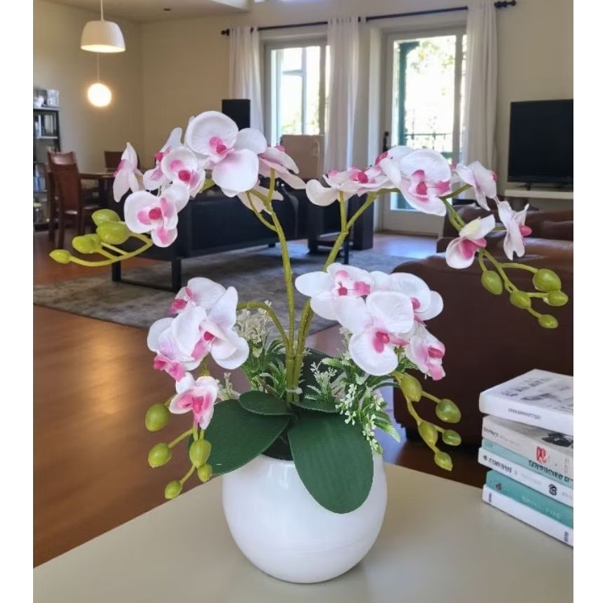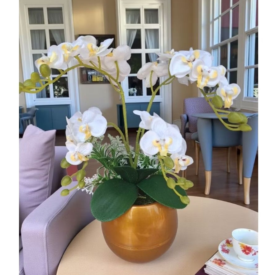 Rangkaianbunga anggrek artificial 4 tangkai dengan pot bola Plastik D15