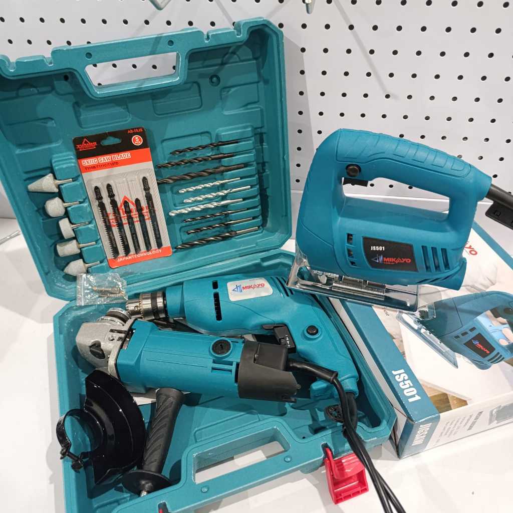 PAKET 4 ITEM PROMO MURAH GERGAJI JIGSAW MESIN JIGSAW + BOR LISTRIK 10MM KAIROS + GERINDA MIKAYO