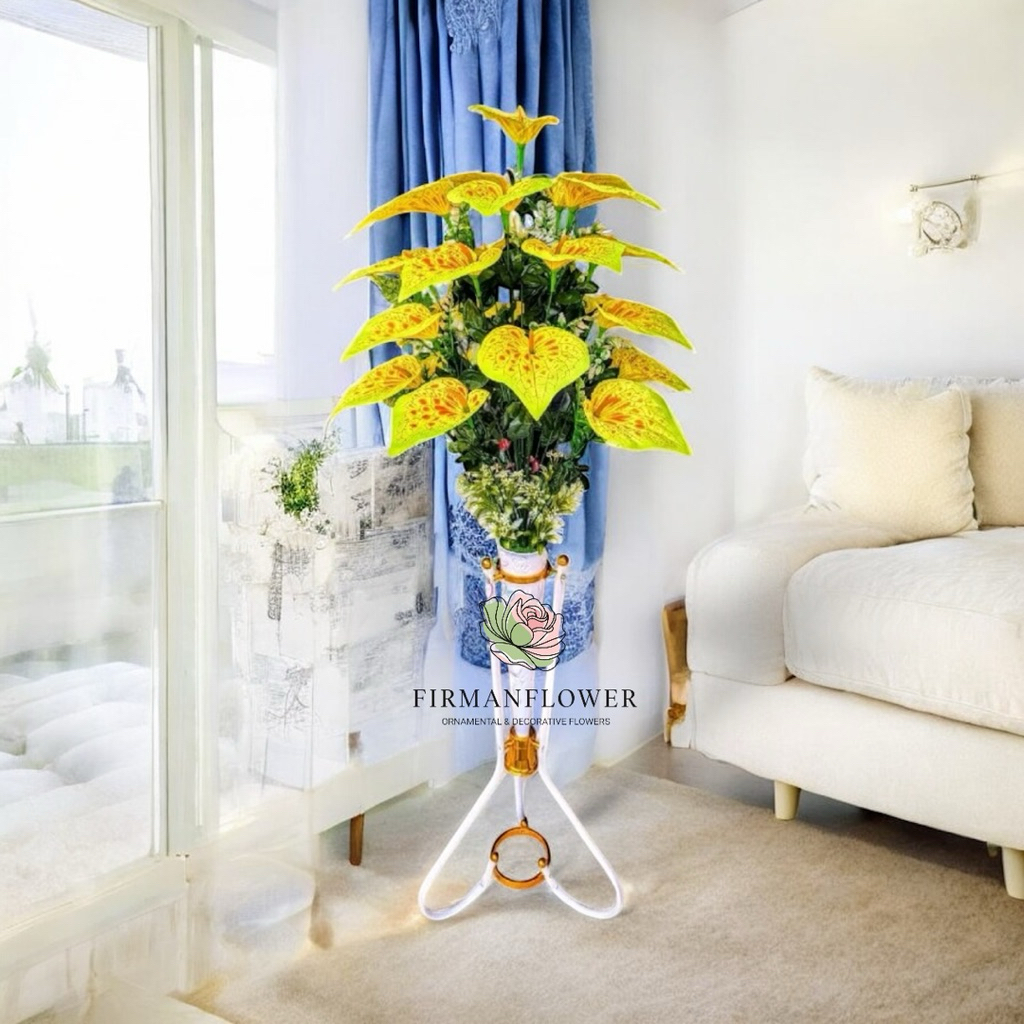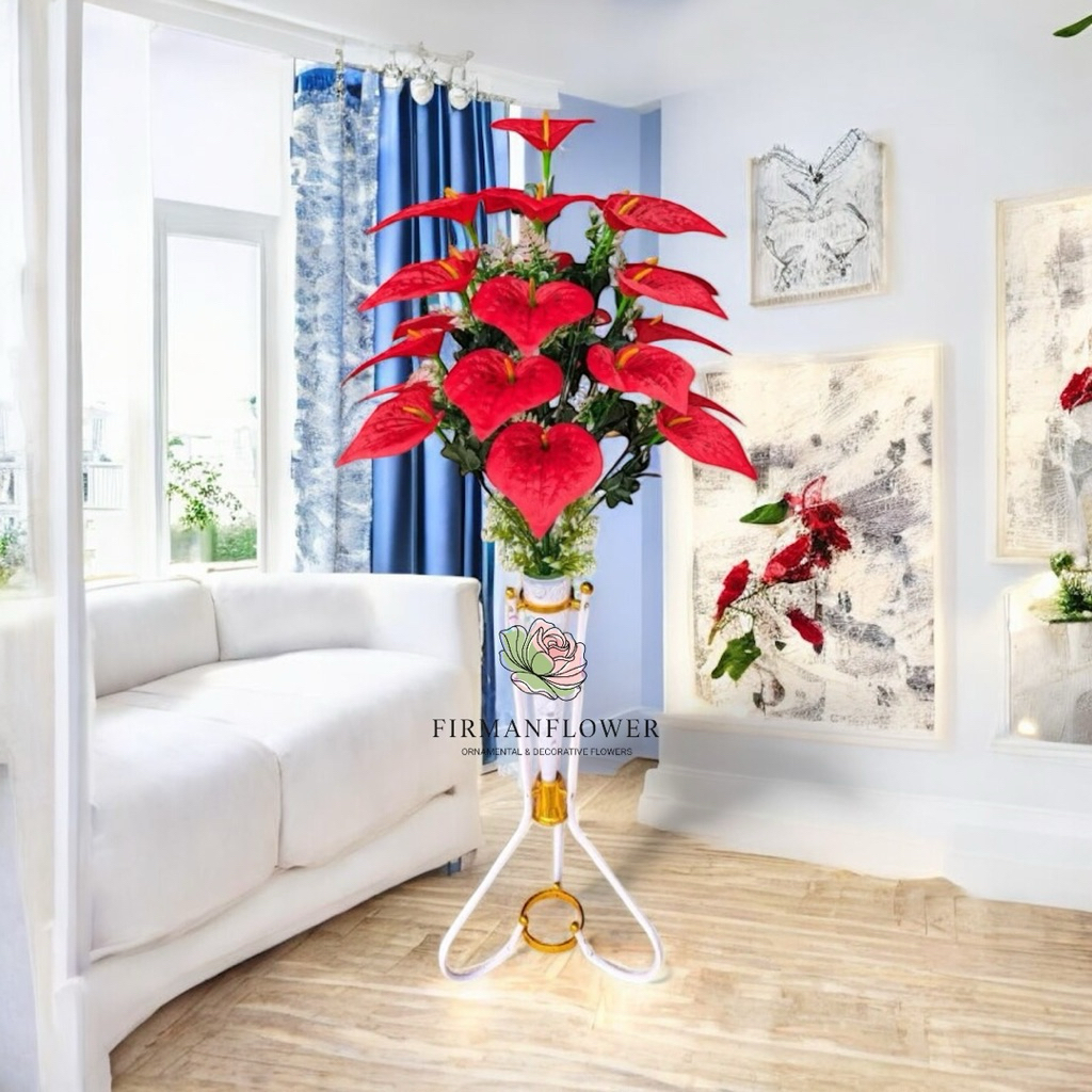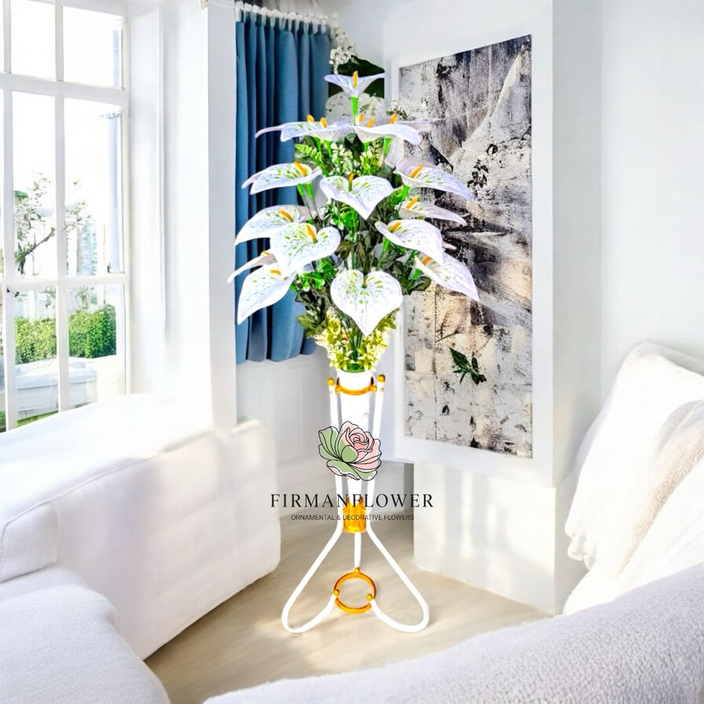 BUNGA HIAS ANTHURIUM ARON PANDA 18.KUNTUM SATU SET LENGKAP DENGAN VAS/POT STANDING BESI CORONG PLASTIK DEKORASI SUDUT RU